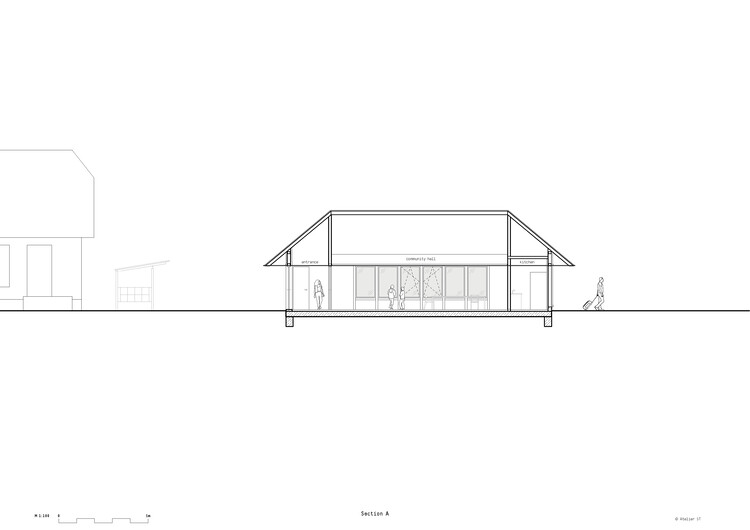 With a floor area of approximately 103 m², the center integrates toilets, kitchen, and a surprisingly spacious communal hall. The hall extends up to the roof and is fully clad in warm timber, creating an inviting and atmospheric interior. A transparent, barrier-free main entrance with an adjoining breezeway provides direct access opposite the station building, while the kitchen and storage area are positioned to the west and can be accessed independently. A wrap-around cantilevered roof allows for sheltered outdoor activities, enhancing the usability of the space year-round.