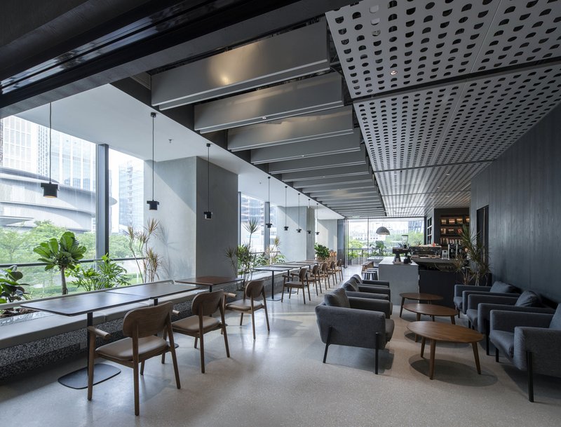 The OWSPACE interior features a well-thought-out arrangement, dividing the cafe into two sections—a community living room for socializing and a quieter area for reading or work. Large glass windows along the south side provide ample natural light, with green planters, seats, and a bar enhancing the overall aesthetic. The cafe seamlessly extends to a terrace area, offering patrons a green oasis with a large eave for shade, creating an ideal setting to enjoy panoramic views of Midea's twin towers.