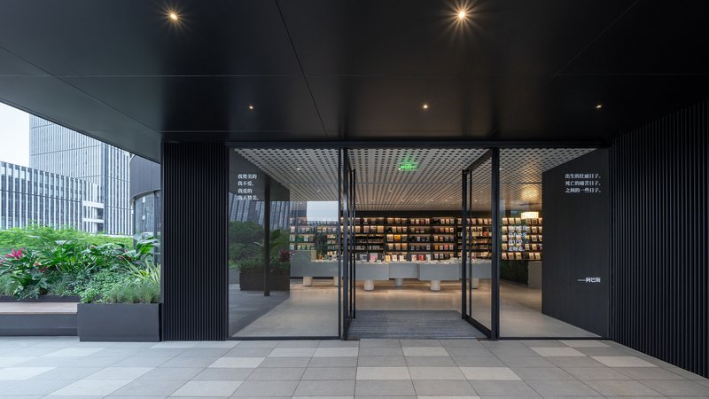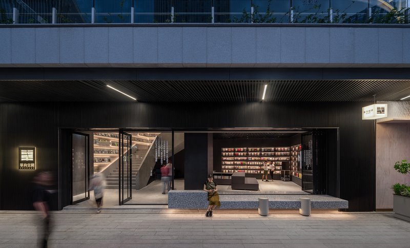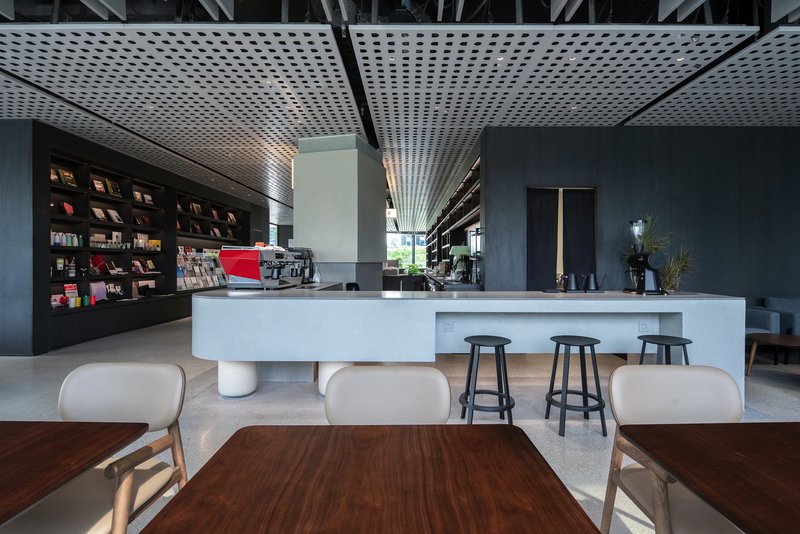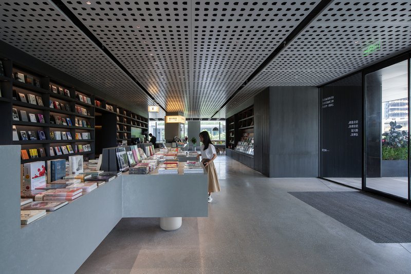 The OWSPACE's main entrance, characterized by a black corrugated aluminum exterior wall, maintains consistency with the brand's image while ensuring a modern and inviting ambiance. Upon entering, visitors encounter a striking 16-meter-long bookshelf display wall, effectively dividing the space into distinct areas—cafe, community living room, and bookshelf area. Despite the modest ceiling height, a patterned perforated aluminum ceiling with integrated lighting contributes to a soft and welcoming atmosphere.