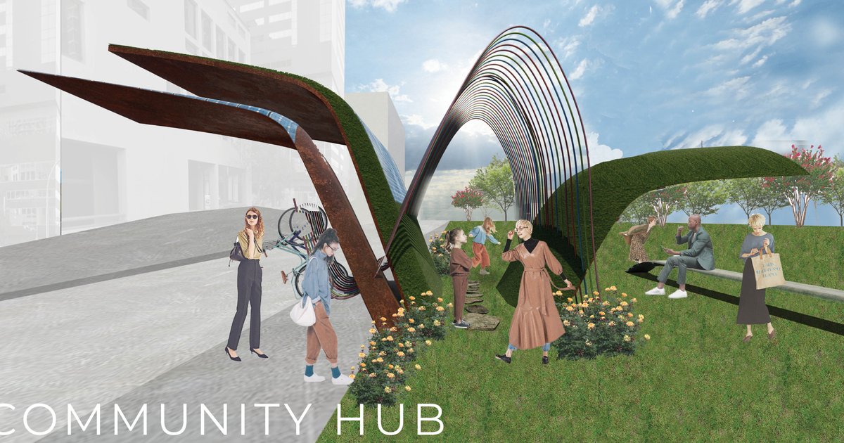 Community Hub is a cultural micro-causum located along the existing bus route in Austin, Texas. The unique culture of Austin has made it “the place to be” drawing in people of all different backgrounds and demographics. What draws people to Austin is the city’s outstanding food, live music, the possibility for outdoor adventures, and its overall weirdness. The demographic of the people of Austin range from young families, a large college-age population, professionals, adventure-seekers, and hippies. The Community Hub helps the city bring this widespread community of people together, offering a sustainable place to wait for the bus, play, rest, or watch a live show within the structure’s performance of the spatial form. The Community Hub addresses sustainability issues, important to the city of Austin, through its implementation of solar panels on the roof of the structure, the green roof, and recycled corten steel construction. The green roof helps the city through reducing the urban heat island effect, promoting biodiversity, cleaning the air, and appealing to the human desire to be close to nature. The Hub appeals to the Austininians' love for the outdoors by creating a “micro park” wherever this bus stop is placed in the city. This area of relief can be enjoyed by families waiting for the bus, people on their way to school, professionals walking to work, or Austin city-dwellers just looking for a good time. The Hub is divided into three main sections. These include the primary bus waiting area, which is paired with bike storage. This unit can be adjusted based on location for increased seating or bike storage depending on the area of the city and proximity to parks.