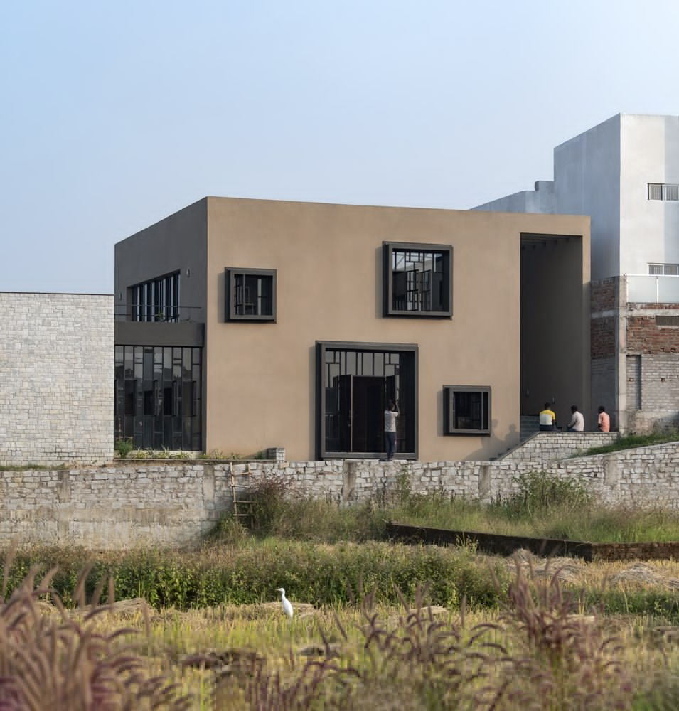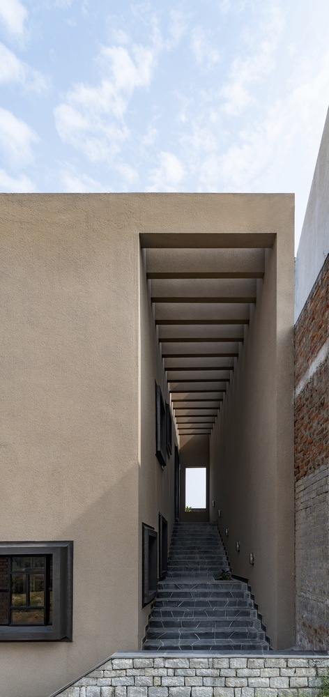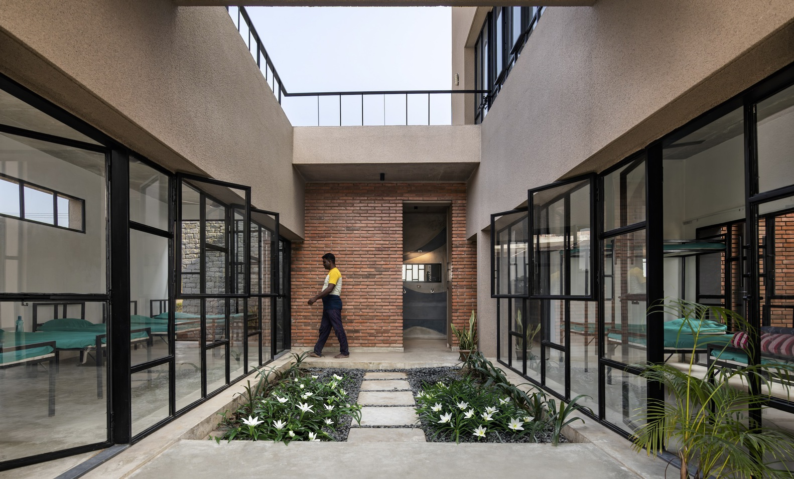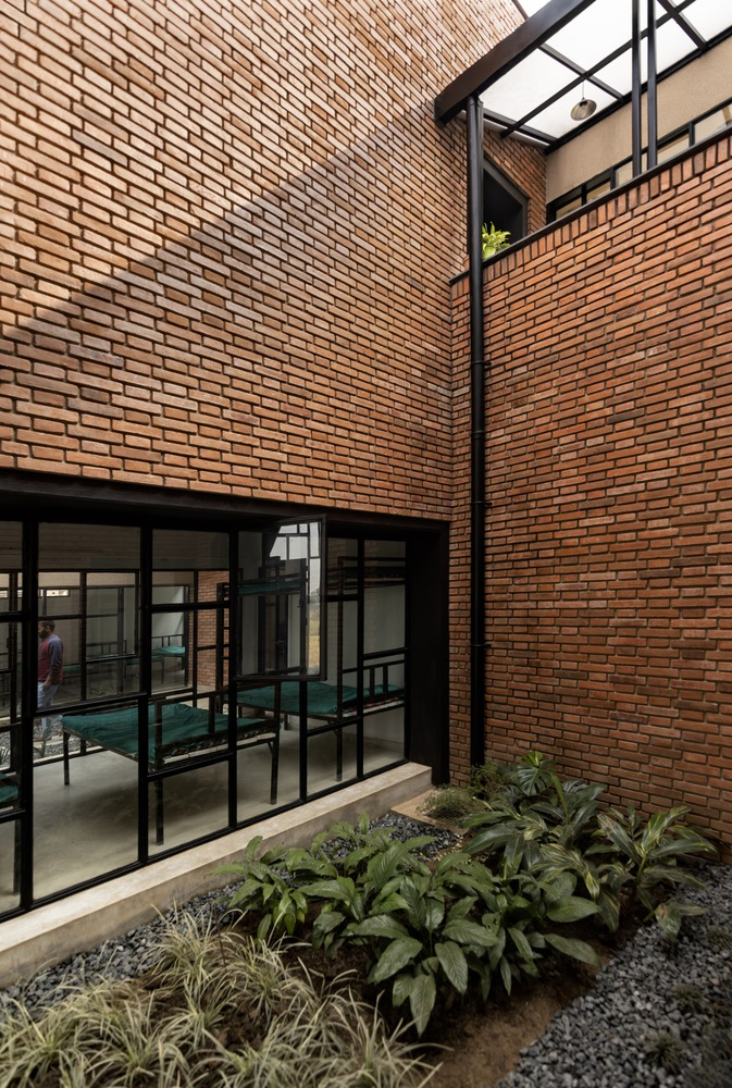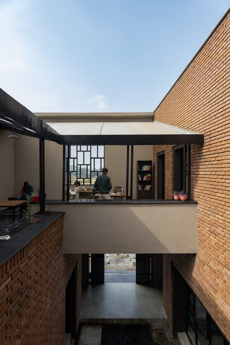 Built on contoured terrain, Compos Mentis combines traditional building techniques with modern construction methods. The design draws inspiration from indigenous courtyard layouts and uses locally sourced stone, brick, and cement, complemented by steel, glass, and polycarbonate in a hybrid structural system. Skilled local masons played an integral role, helping preserve traditional crafts and support local livelihoods while contributing to a sustainable building culture.