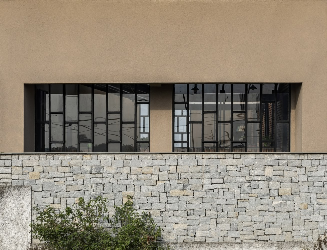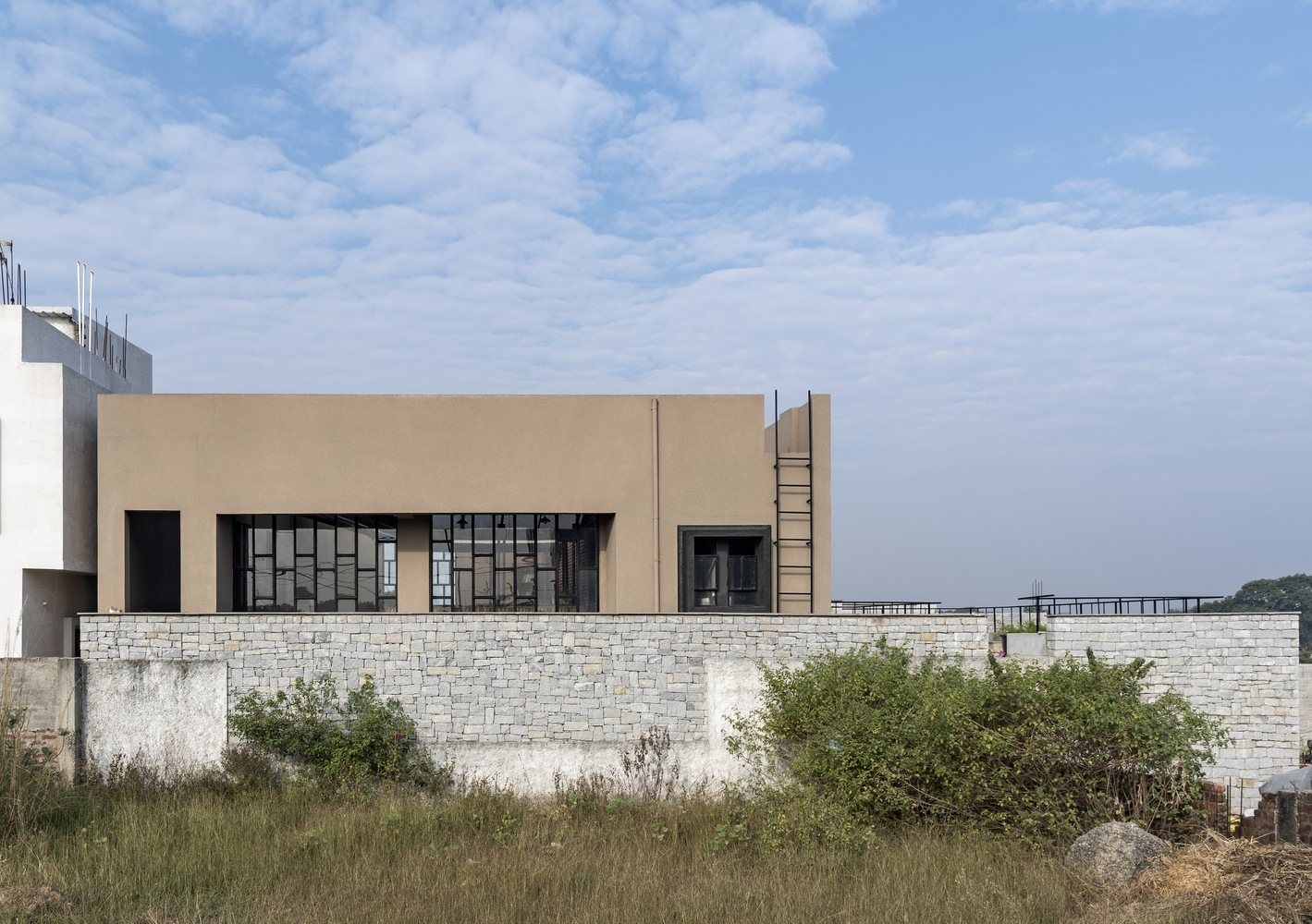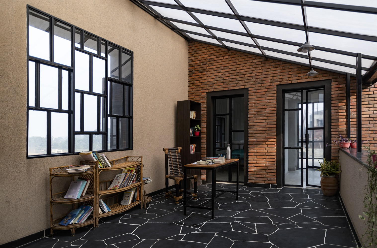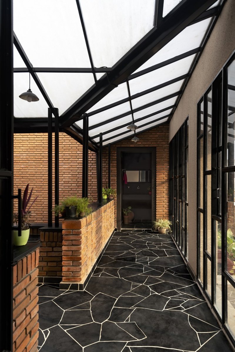Built on contoured terrain, Compos Mentis combines traditional building techniques with modern construction methods. The design draws inspiration from indigenous courtyard layouts and uses locally sourced stone, brick, and cement, complemented by steel, glass, and polycarbonate in a hybrid structural system. Skilled local masons played an integral role, helping preserve traditional crafts and support local livelihoods while contributing to a sustainable building culture.