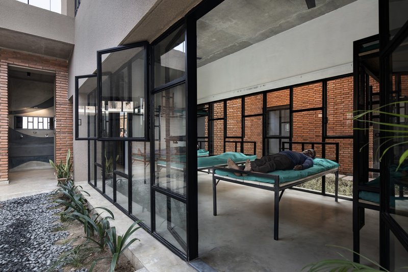 Compos Mentis accommodates a variety of functional spaces, including a consultation chamber, a welcoming waiting hall, a short-stay ward for six patients, an escorts’ dormitory, and an on-site pharmacy. The facility specifically addresses the needs of miners and industrial workers, who constitute approximately 75% of the patient load. Many face challenging working conditions, psychiatric disorders, and substance abuse, making a humane and supportive environment critical for recovery.