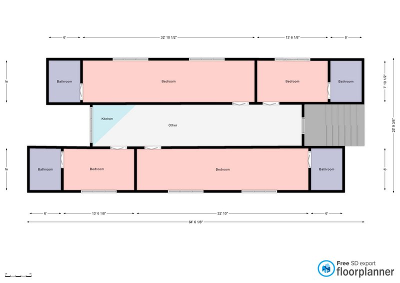 For this container “city”, fifteen shipping containers were used. All of them being 40-foot containers set up in groups of three to make five different dwellings, or in this case, affordable student housing. As you can see below in the blueprint of a single dwelling there are four bedrooms, four bathrooms, and a common area to connect everything together. A staircase is used as the entrance into the apartment which goes up the five stories to connect them all together. This also allows the buildings to be somewhat modular so they can connect and be arranged in different ways so that the layout of these buildings can configure to the area they’re built in.