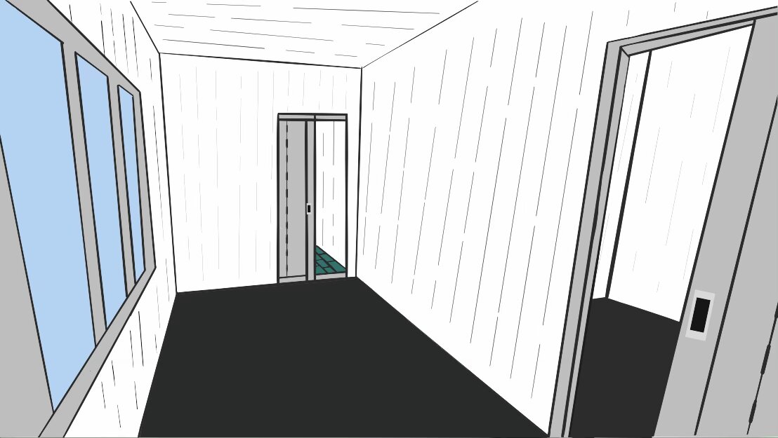 The common area in the middle is a full 40-foot shipping container with the doors to the bedrooms on opposite corners to maximize space in the area. At the opposite end of the main entrance sits the kitchen. The kitchen itself is a full kitchen with a dishwasher, sink, fridge, oven, and microwave. The rest of the space is used for a living area and possibly a washer and dryer, but that all depends on how the school wants to set it up. Looking closely at the blueprints and the picture on the right, you can tell that the door to each room is a sliding door. That is so it saves space and the doors that open don’t swing out and hit furniture or preventing people from putting some things in certain places. A good example of how it looks would be the picture above. That’s also an example of the smaller bedroom and its layout is from a three-dimensional view. Something else that is a great design choice about the bedrooms is how big the windows are, allowing for a lot of natural light to come in and that saves with not only electric bills, but can help warm and cool the rooms depending on how they’re used. One other way these dwellings would save some money is by using common materials. One thing that was used is concrete, not only for the stairs but also the flooring would be a glazed concrete. The exterior would stay the way it is, but interior walls would be insulated and use sheetrock to cover it up. The sliding doors would be made out of wood and so would the frames of the doors. The bathrooms would use tiling as flooring and partially in the walls. Steel would be used for railings up the stairs and supporting these buildings up and together.