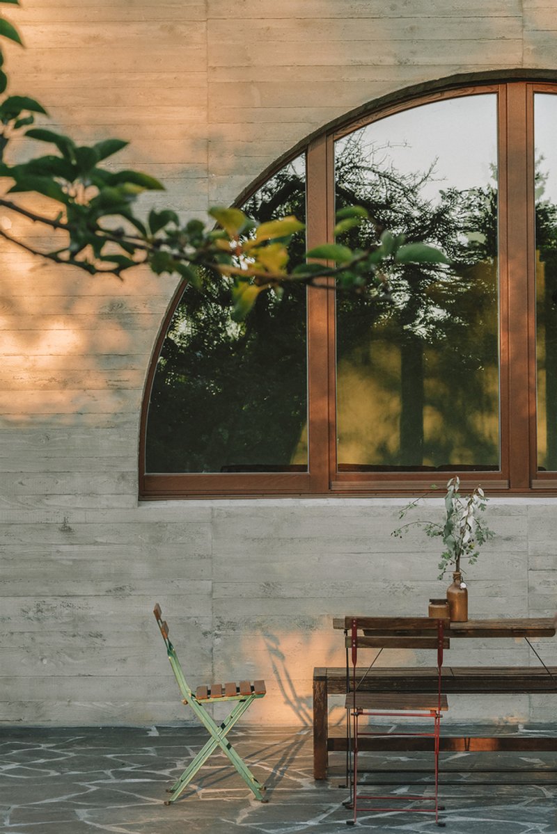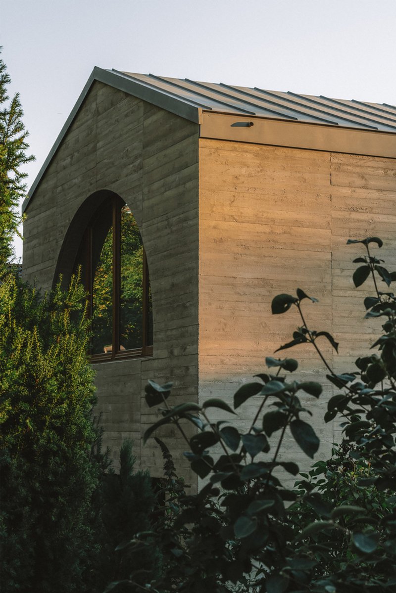 The building welcomes its inhabitants through a generous arched doorway, where the forest's moods are captured through finely structured glazing, setting the stage for a grand foyer area. This leads to a spacious cooking and dining area, further enhancing the home's connection to the outdoor garden.