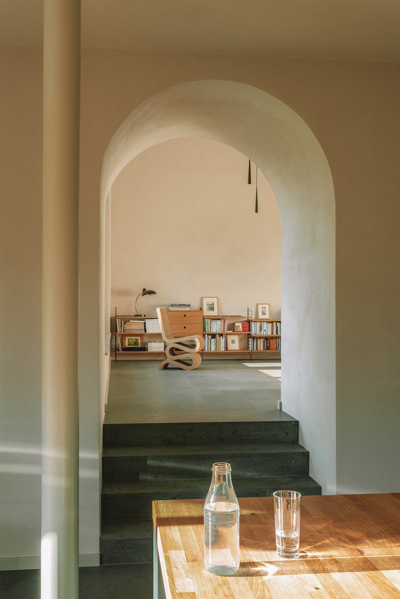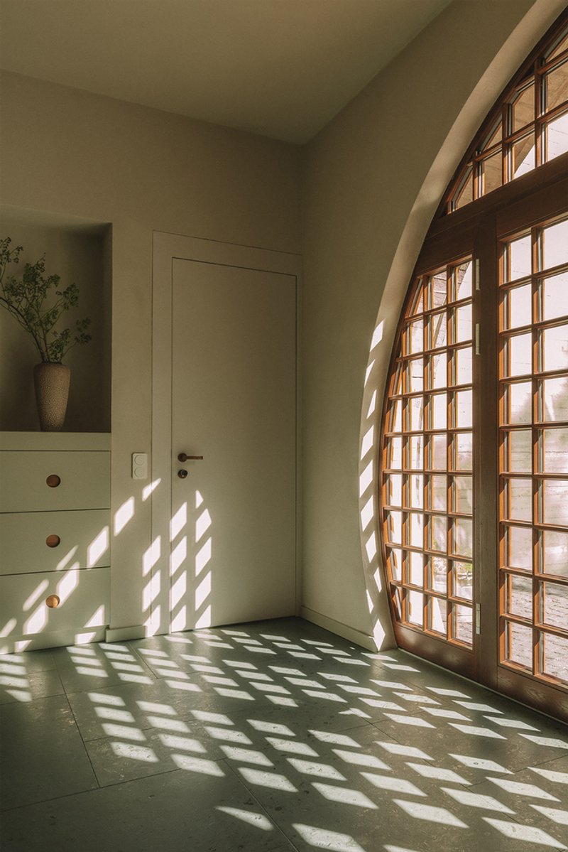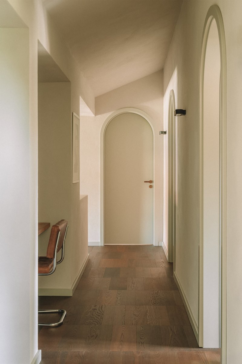 Contrasting the structured exterior, the interior of the duplex is designed to evoke the feeling of a mysterious, sheltering cave. The use of warm, finely textured clay plaster unifies the differently proportioned rooms, creating a cohesive and inviting ambiance. The public areas feature a shimmering green natural stone, extending its elegance to the sanitary facilities and showers, while natural oiled oak parquet graces the private upper rooms, adding a touch of warmth and sophistication.