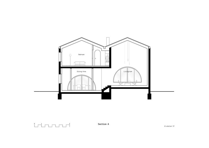 The innovative approach of combining two distinct volumes not only respects the existing building lines but also responds adeptly to the scale of the surroundings. This design strategy ensures a compact and centered accommodation of the required room program, resulting in a clear and straightforward building volume adorned with special openings to embrace nature.