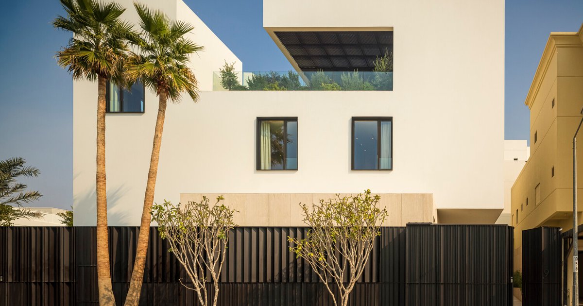 The house’s exterior is defined by clean white volumes framed by a dark steel perimeter fence. This minimalist composition allows the building to stand out while engaging seamlessly with its urban surroundings. The north-facing façade adopts a simple and geometric expression, anchoring the house in its dense neighborhood, while the west-facing façade—overlooking a park—features selective openings that regulate light, maintain privacy, and provide climatic comfort. This careful balance between exposure and seclusion highlights the adaptive nature of contemporary house design in Kuwait.