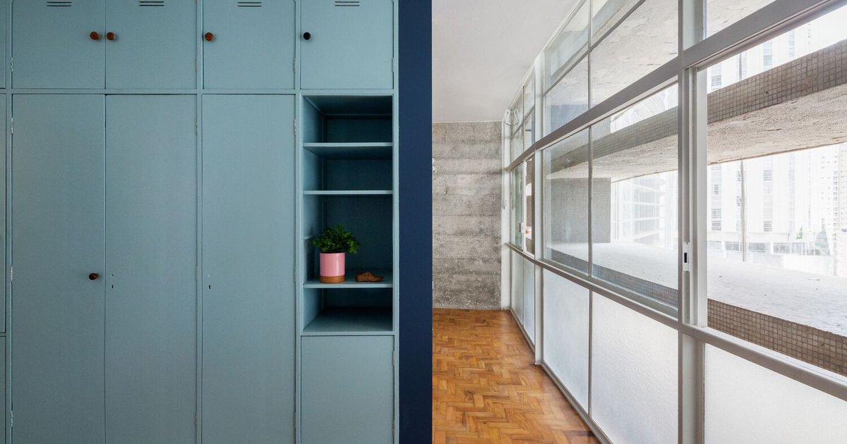 A 40m² Copan apartment renovated by Vereda Arquitetos preserves modernist heritage, enhancing functionality with blue Formica, terrazzo, and exposed concrete.