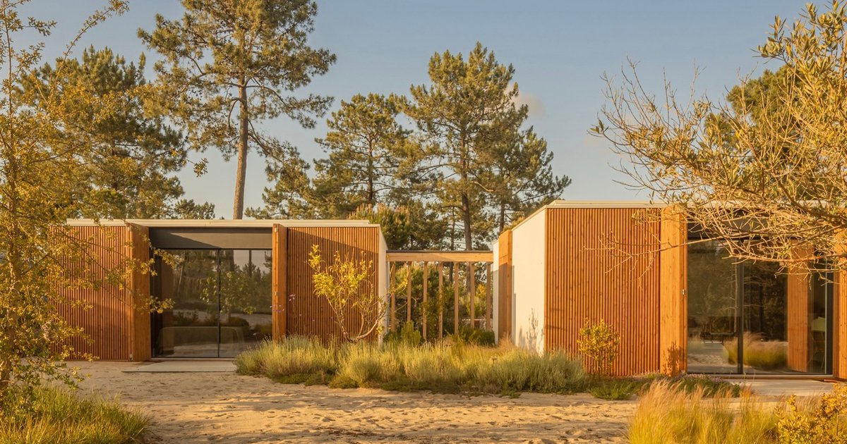 A serene Comporta retreat of glass and wood pavilions, blending indoor-outdoor living, privacy, and nature through warm materials and forest-dune harmony.