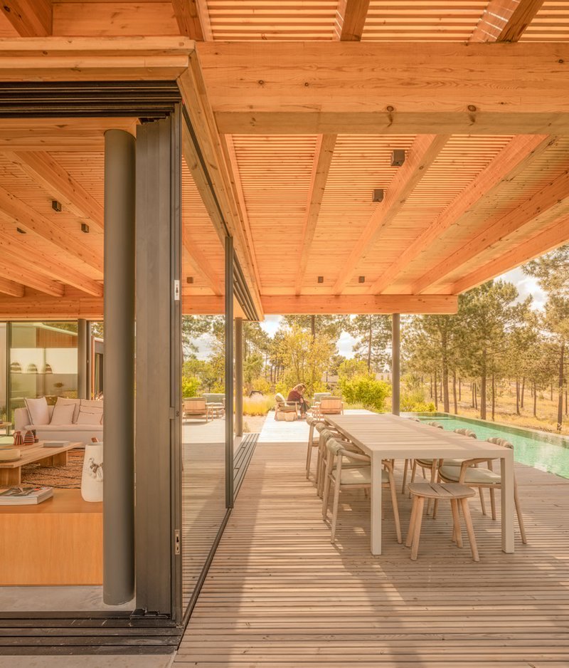 The project draws cultural influence from the Brazilian concept “pé na areia”, meaning foot in the sand—a lifestyle where boundaries between inside and outside dissolve, and life flows freely through nature. Although set in Portugal, this spirit infuses the design, celebrating informality, barefoot comfort, and complete immersion in the environment.