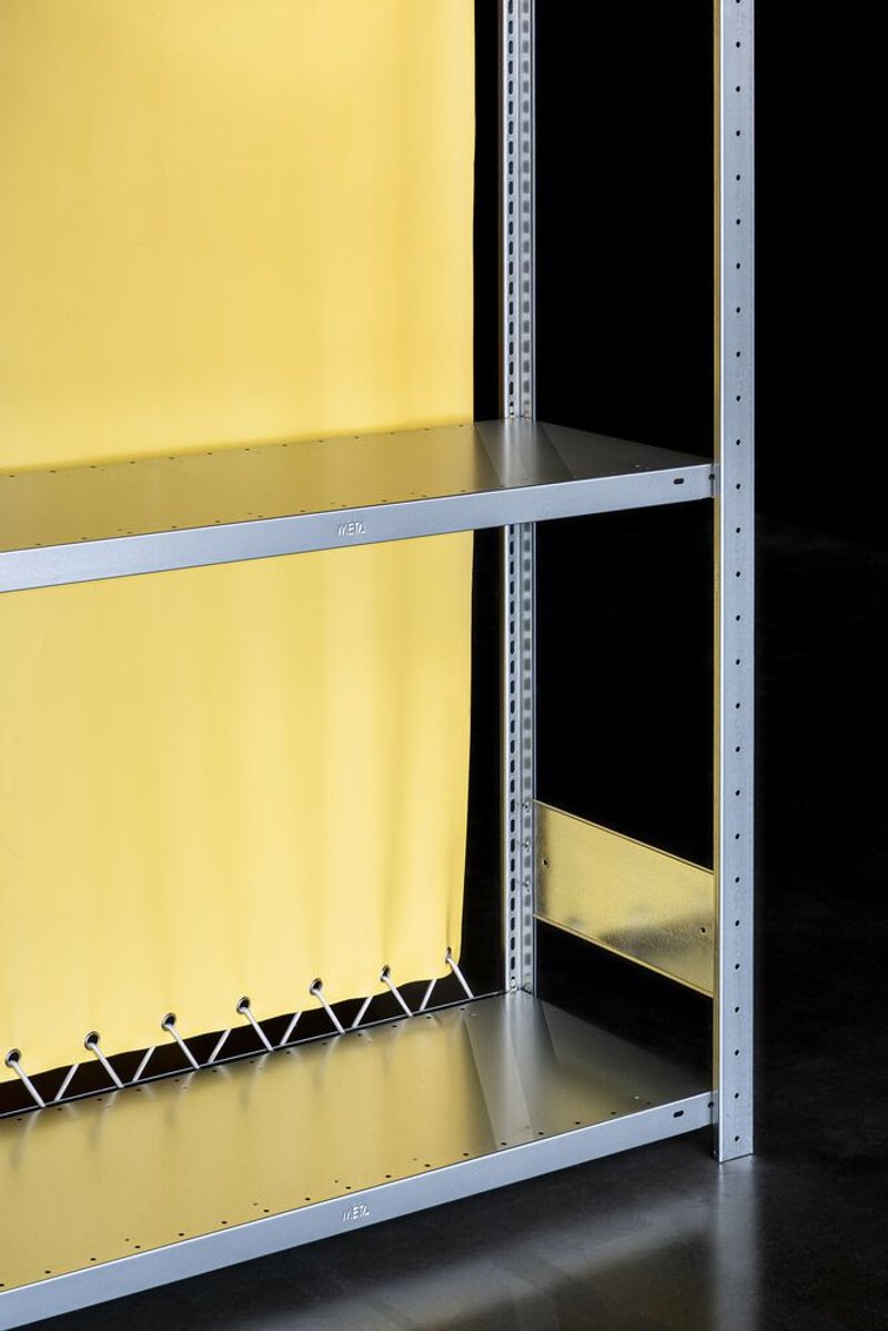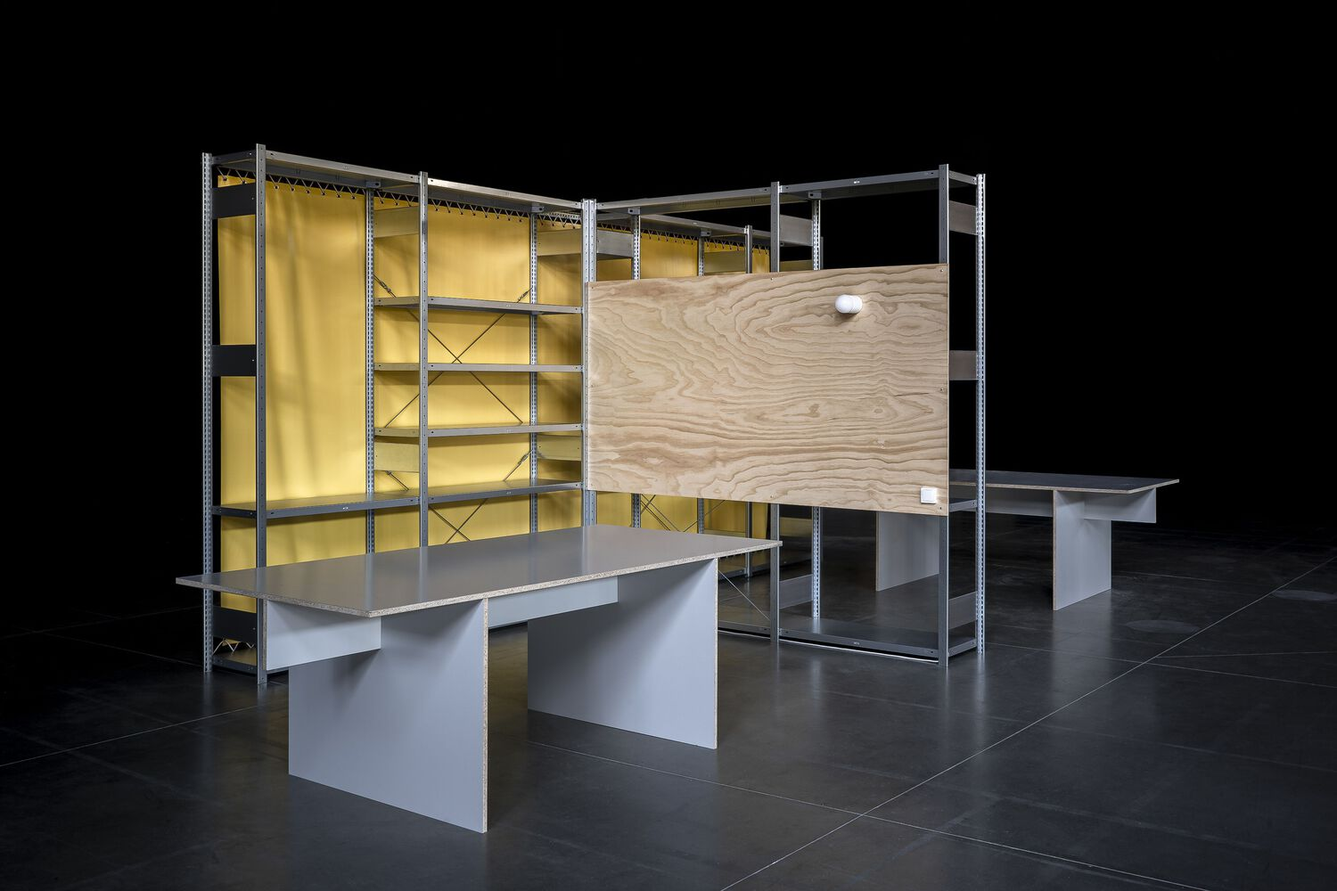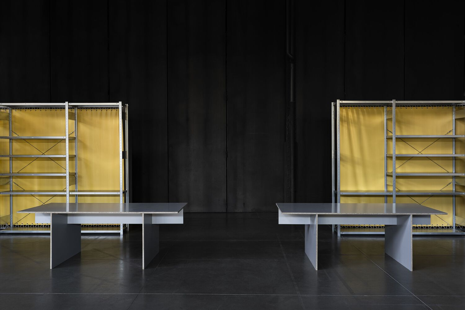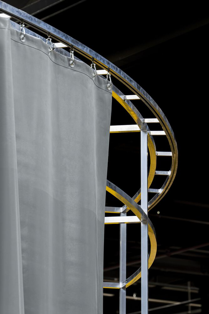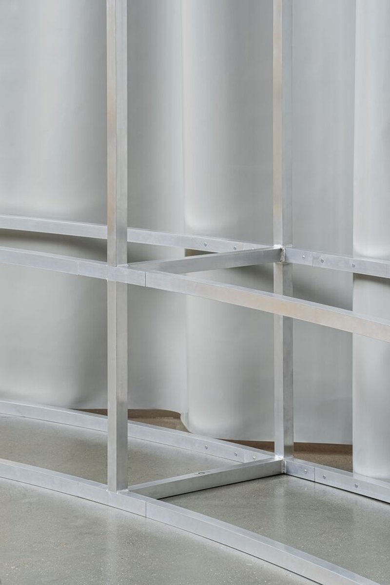 A mobile semicircular aluminum structure with a curtain acts as a presentation space or meeting backdrop. It can be repositioned easily, allowing for spontaneous gatherings or formal showcases. Meanwhile, additional workspaces and storage areas are separated from the rest by translucent textile walls—offering visual permeability while subtly delineating functions.