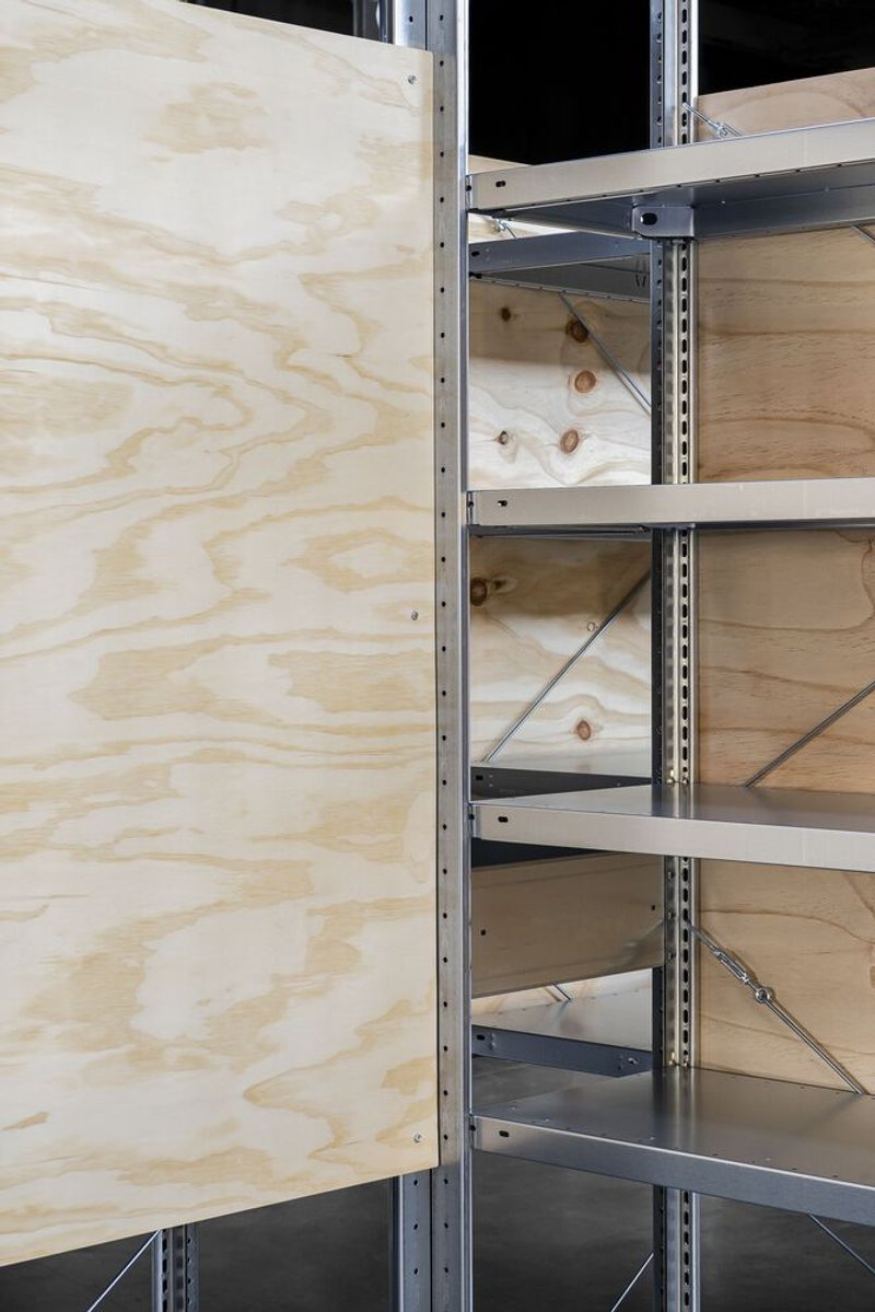 At the core of the spatial organization are large, freestanding storage structures shaped like “+”, “T”, and “L” forms. These create independent yet equal quadrants, giving each of the four resident artists their own defined work area. Each module features dedicated lighting, built-in storage, and acoustic buffering—promoting focused, self-directed artistic production within a shared framework.