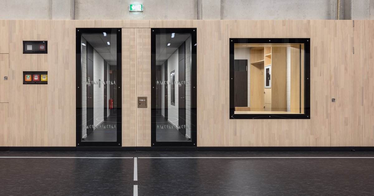 As one steps inside the hall, the aesthetic impact unfolds with simple precast concrete elements dominating the space. These elements seamlessly contrast with a finely detailed impact wall crafted from warm-toned solid wood slats. The intentional design choices create a visually engaging interior that transcends the typical expectations of a sports facility.
