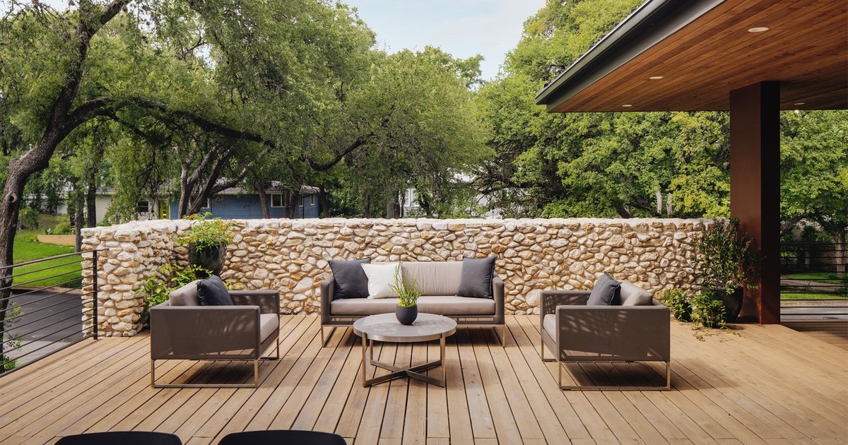 The homeowners wanted a modern and timeless home, and they focused on using local natural materials in the design process. The result is a residence with strong horizontal roof forms intersected by vertical rusticated rubble masonry elements against a smooth, dark stucco framework.