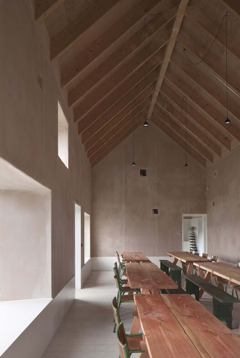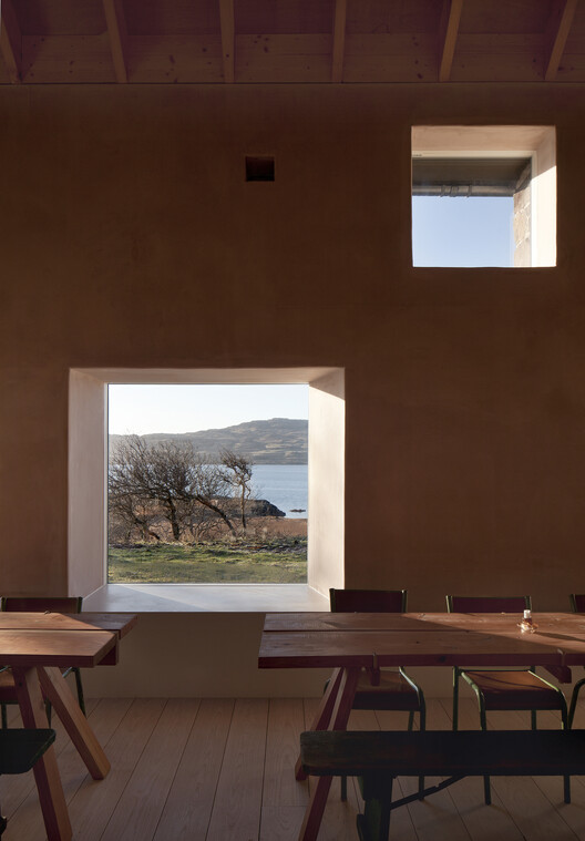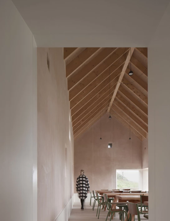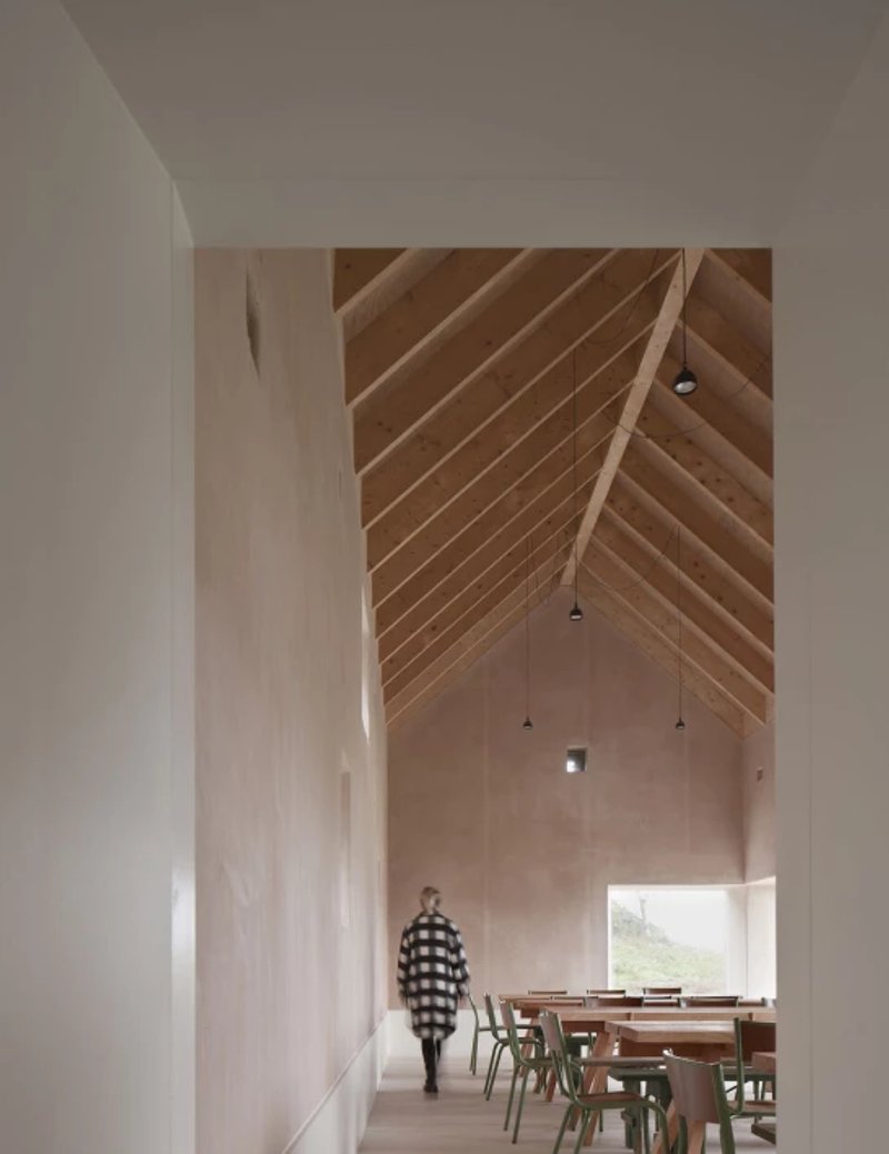 Visitors approach the building from the road above, descending into a low foyer that reveals the grand dining hall in stages. This journey creates an intimate sense of arrival, disassociating guests temporarily from the dramatic landscape before unveiling breathtaking views of the sea, bay, and distant islands. The dining hall features American White Ash timber floors, soft salmon-toned plaster walls, reclaimed French café chairs, brewers' benches, and custom Douglas fir tables, all designed to highlight local craftsmanship. Exposed pine rafters and plywood ceilings bring warmth to the tall, open space, while deep-set windows and flush new apertures respect the barn’s original form.