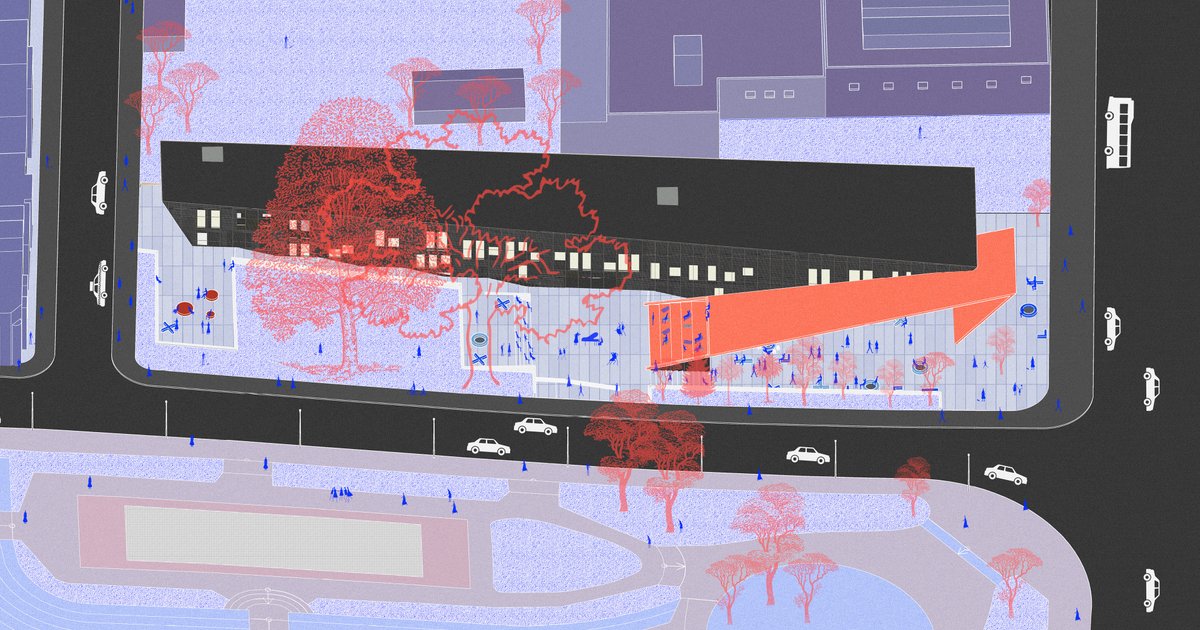 The main black structure, which abstracts the male figure in dance, encompasses all internal functions, while the striking red structure, representing the female figure, brings life to the outdoor environment by serving as a sheltered space for the external dance floor. It also functions as a cover for the square in front of the internal auditorium.