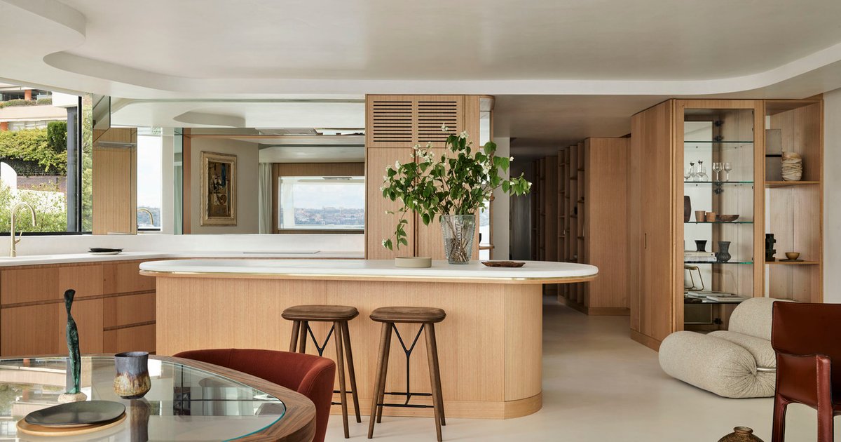 Darling Point Apartment by Studio ZAWA transforms a 1960s floor plan into a serene, tactile waterfront home with panoramic Sydney views.
