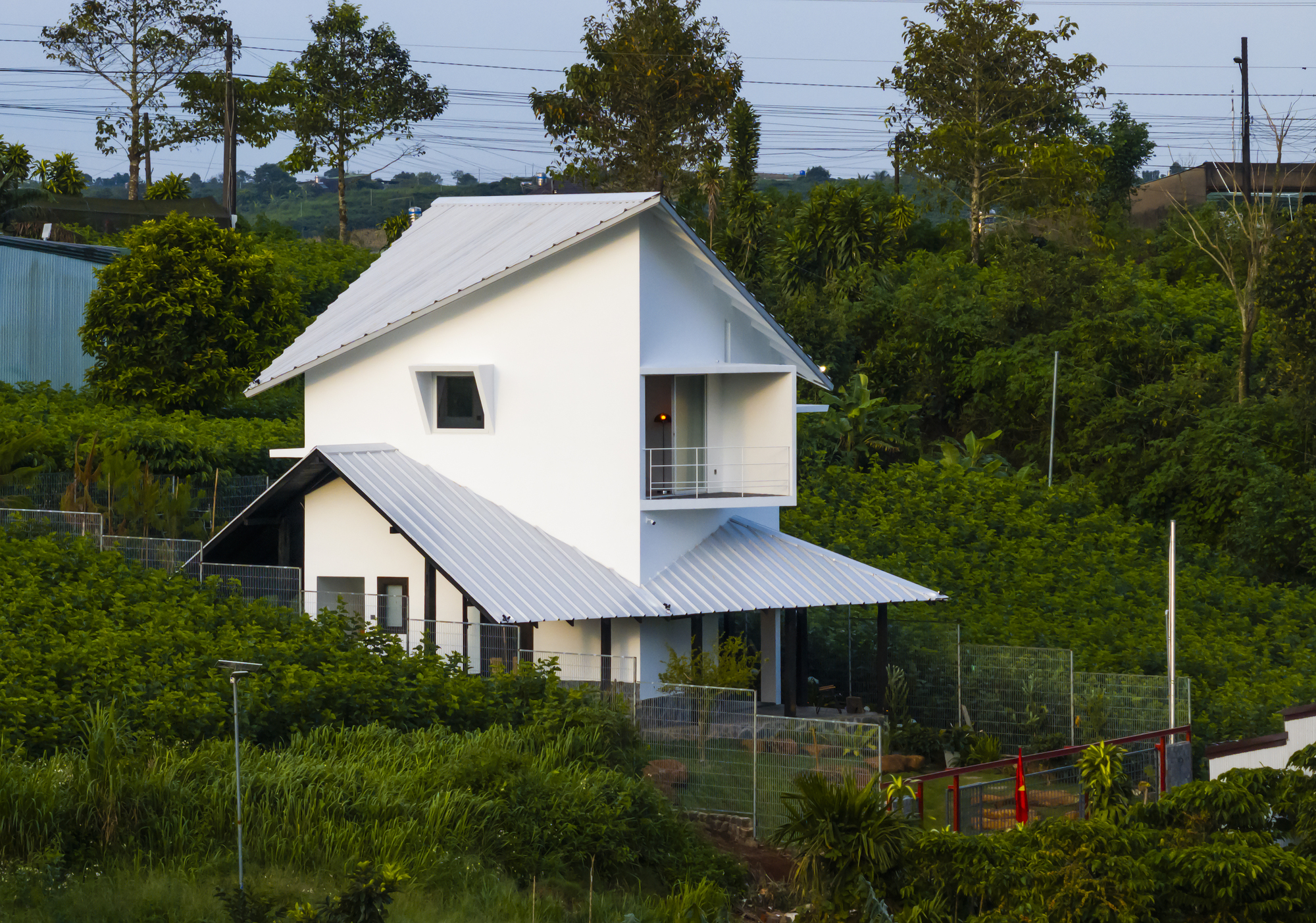 The bedroom extends to a private balcony that hovers above the valley. From here, Bao Loc unfolds like layered green fabric, with wind that carries the scent of soil and leaves. At night, the white roof catches moonlight, and landscape noises replace urban sound. The house becomes a place where silence is not absence but presence.