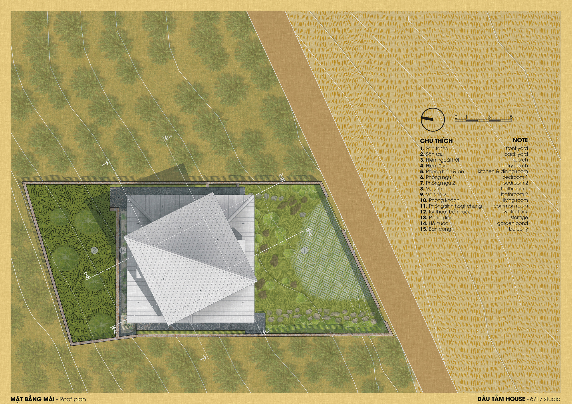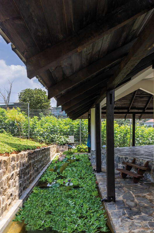 The roof pitch helps rainwater move rapidly and quietly downward, reducing acoustic impact during heavy storms. Gardens placed around the building capture runoff and stabilize soil. By engaging climate rather than resisting it, Dau Tam House behaves like a living organism, adapting and cooperating with environmental rhythms.
