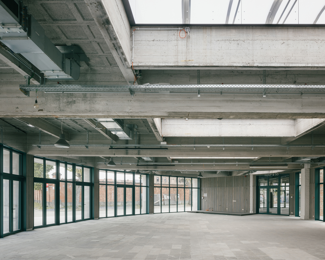 Technical specifications include high-performance window systems such as Reynaers Aluminium’s MasterLine 10, ensuring thermal efficiency and daylight penetration, while maintaining the historical facade aesthetic. Acoustic planning by Bureau De Fonseca further enhances interior comfort, supporting a wide range of uses, from workshops to market stalls and community events.