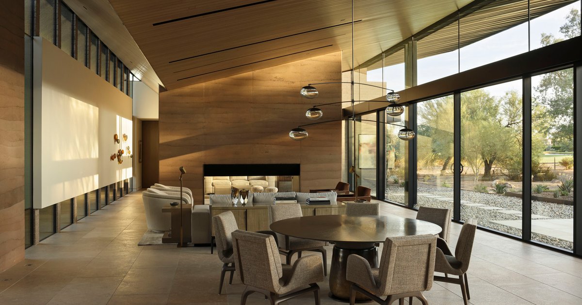 The home emerges gently from a lush tapestry of native desert vegetation. Low, grounded masses define the private zones of the house, while a strikingly folded metal roof plane hovers above the social areas. This architectural gesture is both sculptural and functional, creating dynamic rhythms of light and shadow reminiscent of the ribs of a cactus. Layered masonry forms and rammed earth walls shield the interiors from the intense western sun, providing both thermal comfort and a connection to the earth.