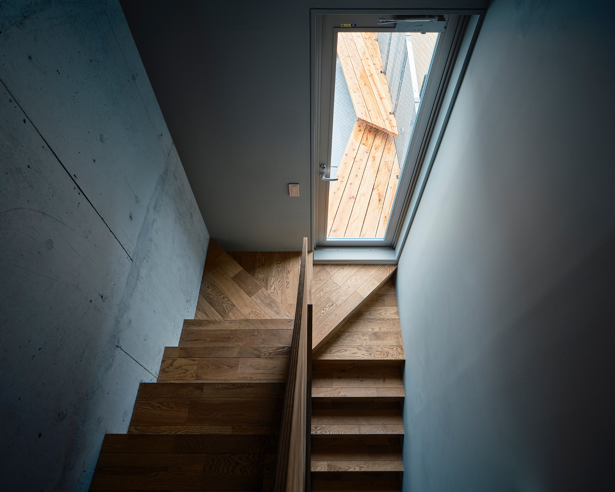 Further reinforcing this concept, the stairwell runs diagonally through the staggered floors, linking platforms and storage spaces at complementary angles. A triangular light garden at the living room’s opening accentuates the diagonal axis, amplifying the perception of space while drawing natural light deep into the interior. The interplay of countless diagonal lines creates dynamic spatial relationships, connecting the interior seamlessly with the terrace and surrounding urban landscape.