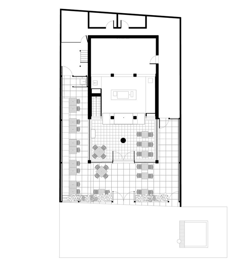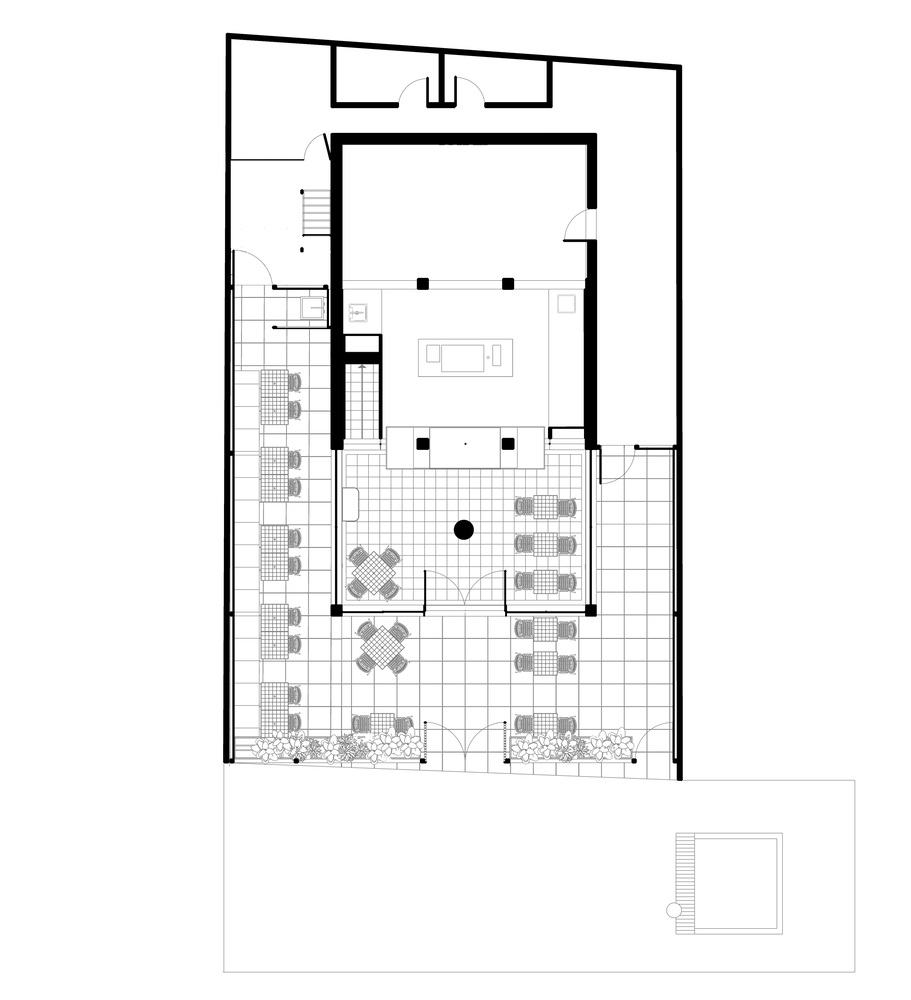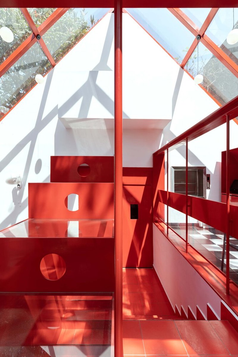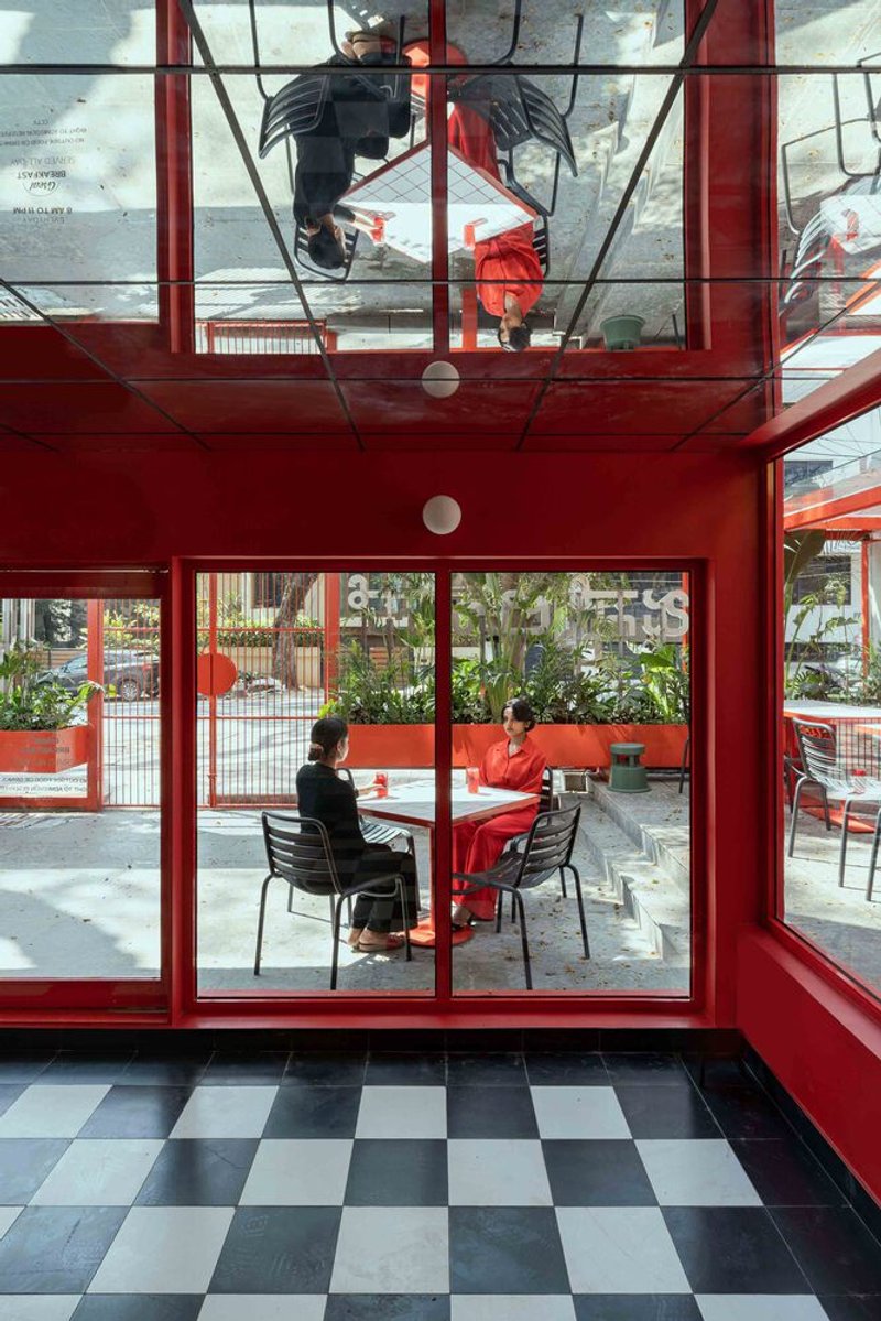 The creative use of the vertical dimension brings a dynamic connection between the street and the sky, maximizing the site's value in the bustling urban environment of Bangalore. The glass roof serves as a visual extension, evoking the surrounding natural environment while enhancing the dining experience with its ever-changing lighting.