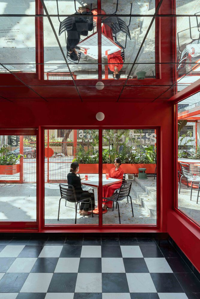 The use of vibrant colours and materials further elevates the dining experience. The black-and-white checkered flooring pays homage to American diner culture, while the selection of materials expands the perception of space. The seamless integration of glass creates a transparent boundary between the indoors and outdoors, offering a fluid connection to the urban environment and bringing natural light into the deeper areas of the restaurant.
