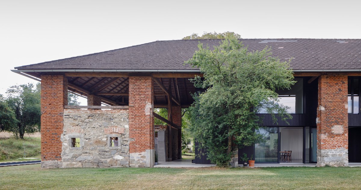 The design concept centers on retaining and highlighting the existing barn structure. The massive brick pillars and the original roof were preserved as load-bearing elements, serving as both functional and visual anchors within the new spaces.