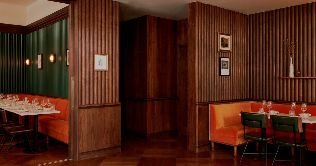 Every seating area in Lupetto is designed to ensure that diners have a perfect view of the restaurant’s vibrant life. A custom bright orange banquette wraps around the main dining area, providing a pop of color and a modern twist on traditional seating, which is becoming more common in trendy dining establishments.
