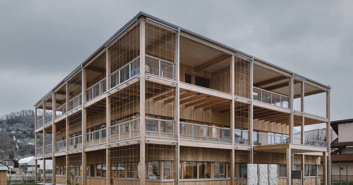 The District Chamber of Farmers in Hallein features sustainable timber construction, green facades, spacious terraces, and functional, future-oriented office design.