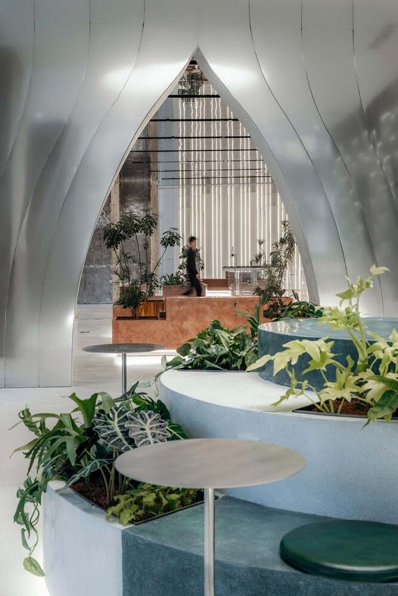 The three-layered depth of the aluminum simulates a cascading waterfall. Ingeniously, the outer layer conceals a functional canopy, ensuring visual continuity while offering weather protection. Inside, steel bookshelves shaped like raindrops carry this visual motif throughout the interior, establishing a seamless dialogue between exterior and interior design.