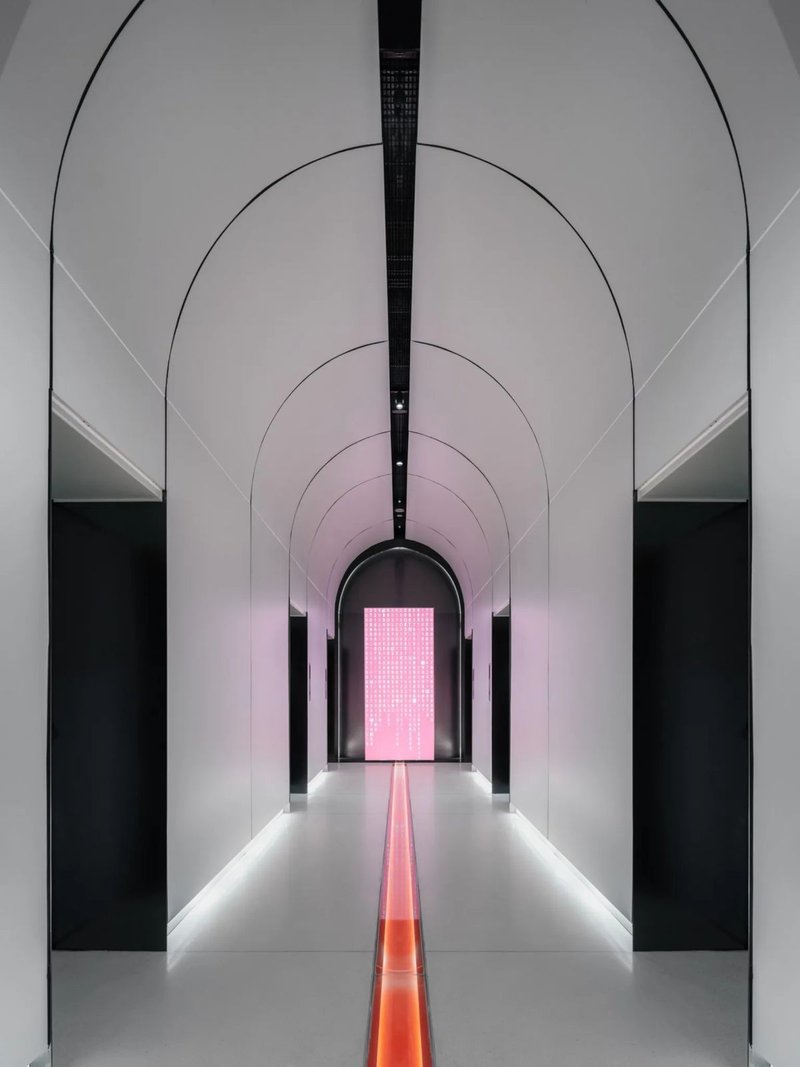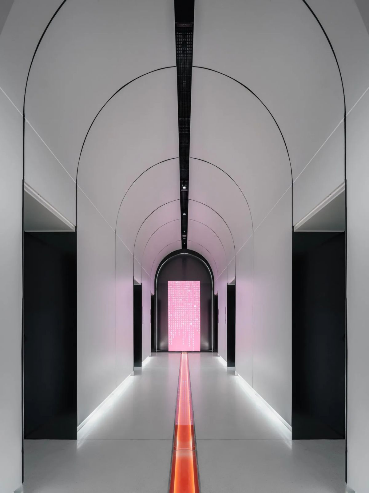 A red digital obelisk, inspired by 2001: A Space Odyssey, stands at the lobby’s center. Unlike Kubrick’s monolith, this one pulses with a digital rain of cascading code — silent but alive. It anchors the space like a beacon, both sci-fi and sacred.
