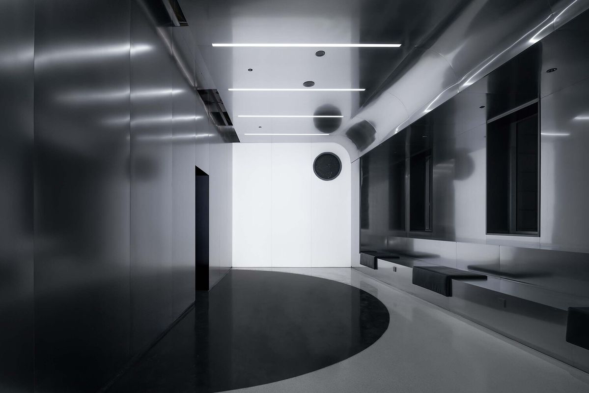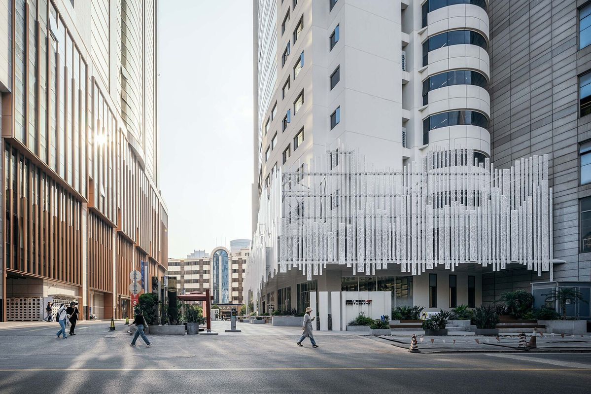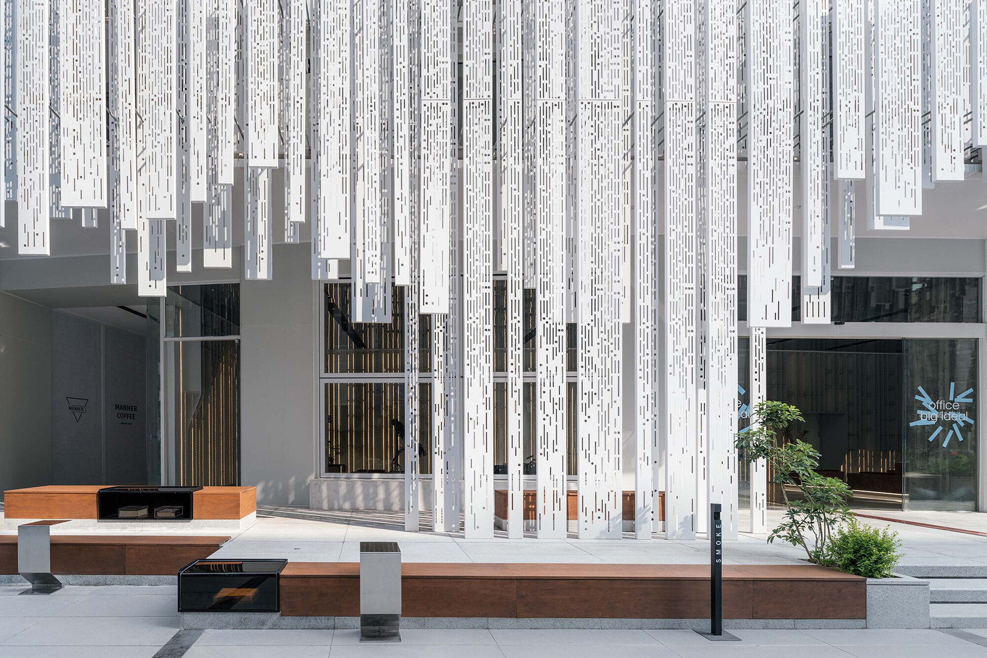 The standout feature of the project is its façade — a kinetic, layered metal curtain known as Iron Rain. Using over 500 perforated white aluminum panels in varying widths (160 mm, 320 mm, and 480 mm), Wutopia Lab recreates the visual sensation of a torrential downpour. These panels are punctuated with dots and dashes in Morse code, encoding a hidden message and adding a sense of mystery.