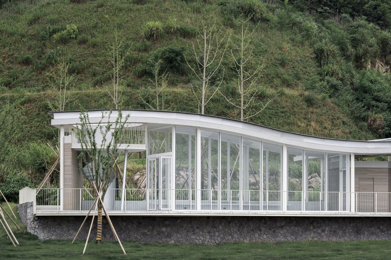 A row of ginkgo trees strategically placed at the center of the station creates a natural screen, shielding visitors from the nearby southern mountain and introducing a moment of visual suspense. The station’s layout is divided into two distinct zones: a public-facing area with reception, retail, and restrooms, and a more private dining area tucked behind the trees. The two areas are set at different elevations—one aligned with the road, the other rising above the prairie—connected by an outdoor walkway framed by walls and a roof. This walkway forms a narrow, precise opening, offering visitors a framed, almost cinematic view of the landscape.