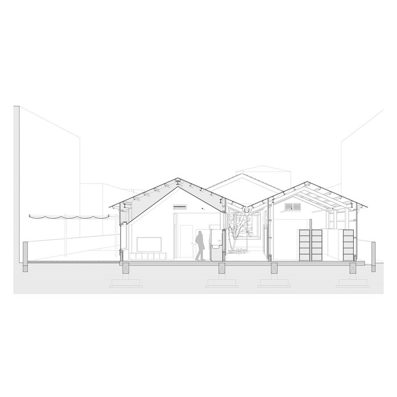True to its name, the Double Roof House is structured by two sets of double-sloped roofs, giving the impression of multiple overlapping houses. This design both references the ad-hoc nature of rural iron-clad homes and establishes a new architectural typology. The double roof does more than offer formal identity—it also creates additional height and ventilation, while forming spatial pockets that modulate openness and privacy. The layered roofs act as a unifying gesture, bringing cohesion to the independent elements below.