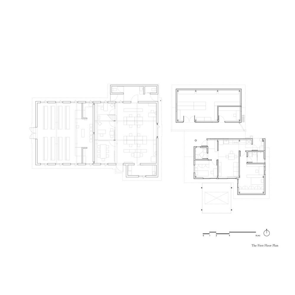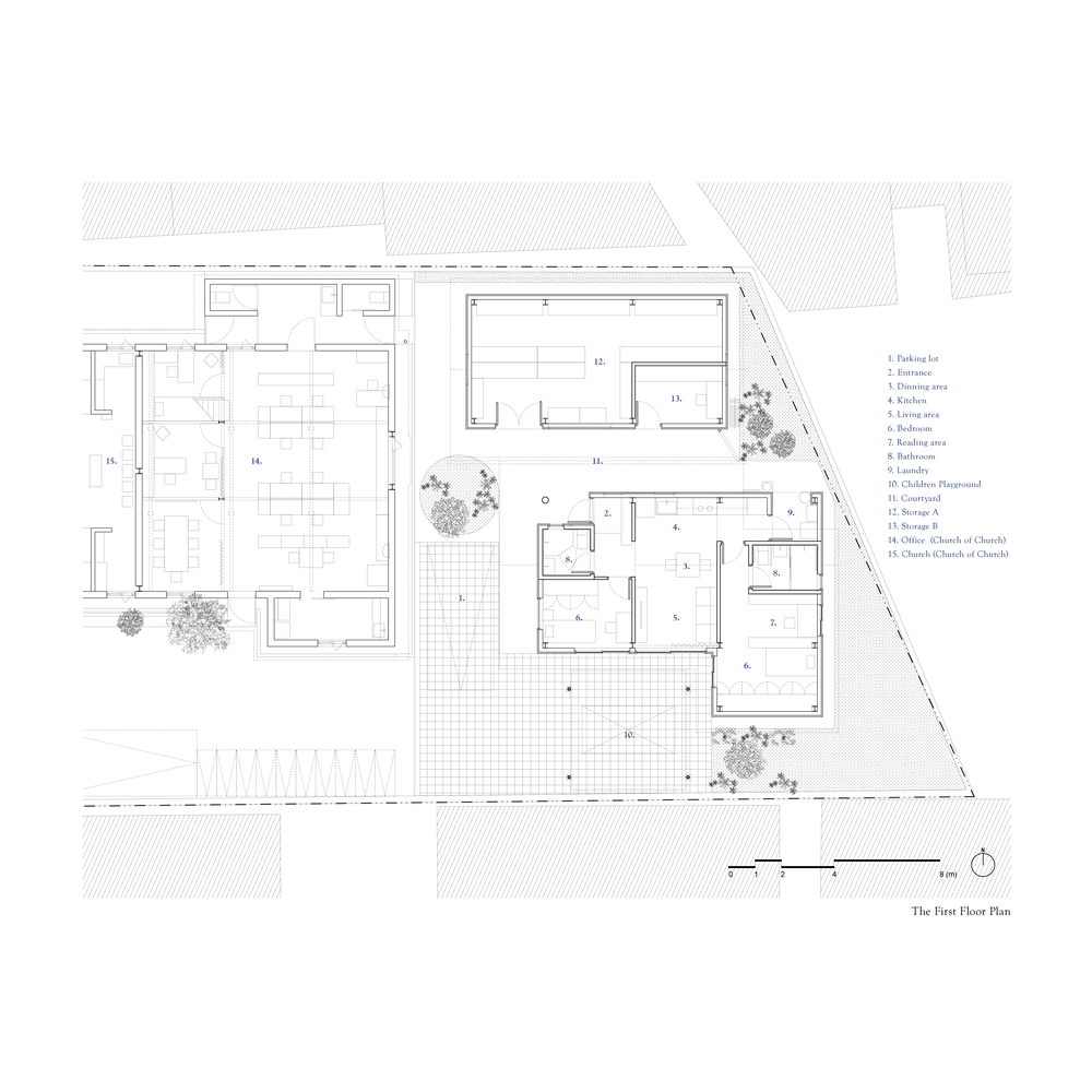 The design centers on an undefined “in-between” space aligned with the central axis of the church. This space is not merely a corridor or void; it serves as a transitional threshold that links the various building components without sacrificing autonomy. Each functional zone—residential, storage, and recreational—is physically and symbolically connected through this shared architectural rhythm, made possible by the double roof system that spans across and within the volumes.
