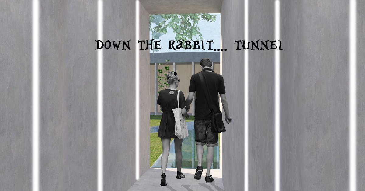 The designed object was supposed to be a clean, simple block leaning out of the ground and inviting the user inside. . and then what? Apart from small references to Alice and a lot of greenery both inside and around the building, it was decided to introduce a second reality, so as to bring out an element of magic from the designed space. Augmented reality is a modern technique that combines the real world with computer generated reality. With special glasses, users would be able to see elements that are not there in reality. Thanks to this, the interior can become magical, and when you don't feel like it anymore, all you have to do is take off the glasses - you can decide for yourself when you want to find yourself in which world. Augmented reality could not only be an element that creates a space but could also be used in organizing games or events.