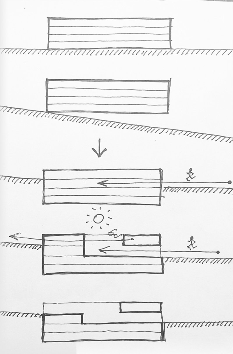 The process of creating the concept took a really long time. Above all, the challenge was the varied terrain, which often did not harmonize with the ideas that emerged. Each successive dash, however, pointed toward a large open atrium that still made me think of a rabbit hole. And that was the starting point that really sculpted the final form.