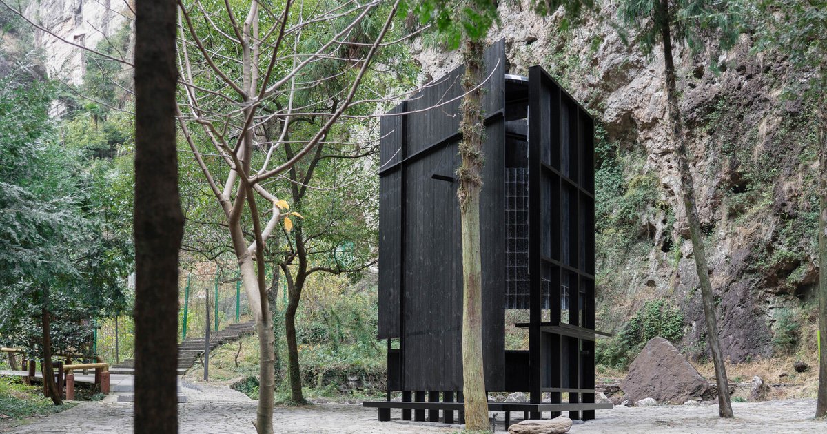Inspired by the raindrops that form between the tiles of traditional East Asian architecture, the pavilion reimagines the function of eaves, transforming them from external shelters into integral interior elements. The charred black timber exterior contrasts with transparent glass tiles, which are layered to create a poetic interplay of light, shadow, water, and reflection. Sunlight filters through the gaps, casting a dynamic display of textures across the space, enhancing the connection between the built structure and its natural setting.