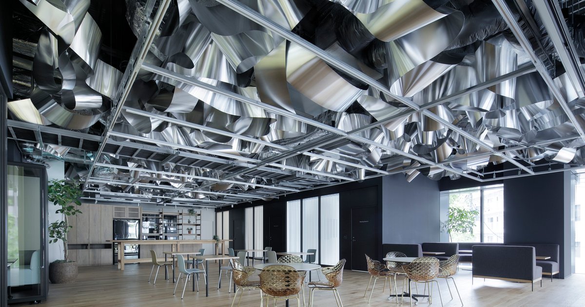 The concept of the Waterscape Office draws inspiration from Japanese traditions like kimono-making, origami, and furoshiki, where limited resources are transformed into versatile and functional designs. This principle is manifested in the use of a single "recycled" aluminum sheet that covers the ceiling, creating a dynamic and visually captivating space. The undulating metallic waves emulate the sunlight reflecting off rice paddies, a nod to Gotanda’s agricultural past.