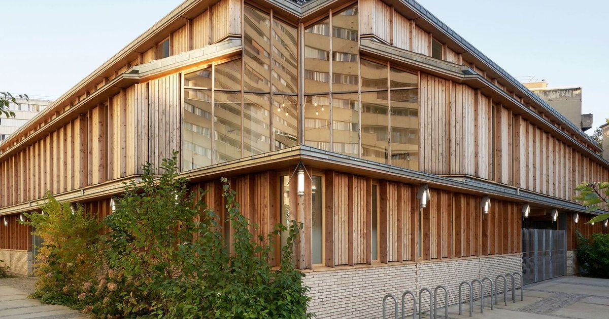 The wood-clad exterior, combined with generous glass openings, showcases the building’s structural framework, reinforcing its transparency and openness. Two white brick chimneys, extending from the underground parking area, highlight the integration of public facilities with the existing urban infrastructure.