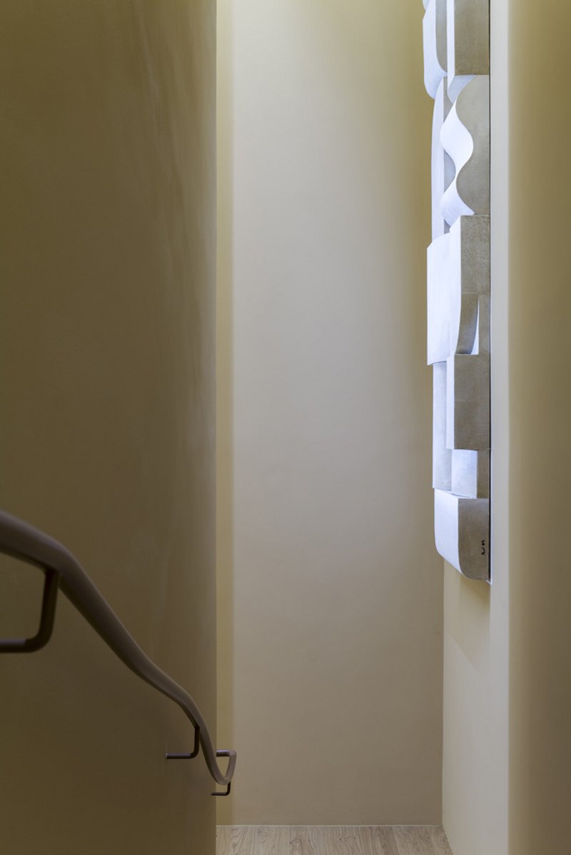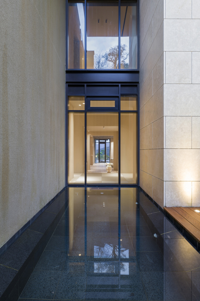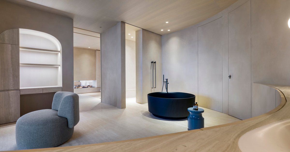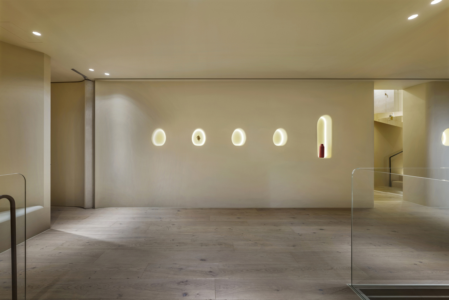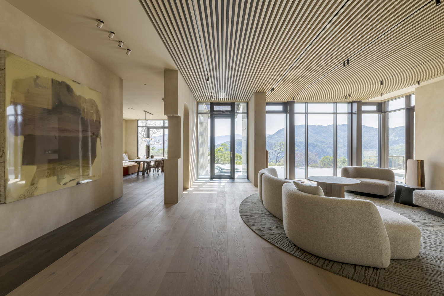 Peny Hsieh Interiors chose materials that emphasize a grounded, calming ambiance. Walls coated in mineral textures, floors and furniture crafted from natural wood, and muted textiles in sandy earth tones all contribute to a serene atmosphere. This organic palette is elevated by the striking verticality of the entrance foyer, where a custom nine-meter-high lighting installation made of hand-blown glass evokes mist gently rising from the mountains.