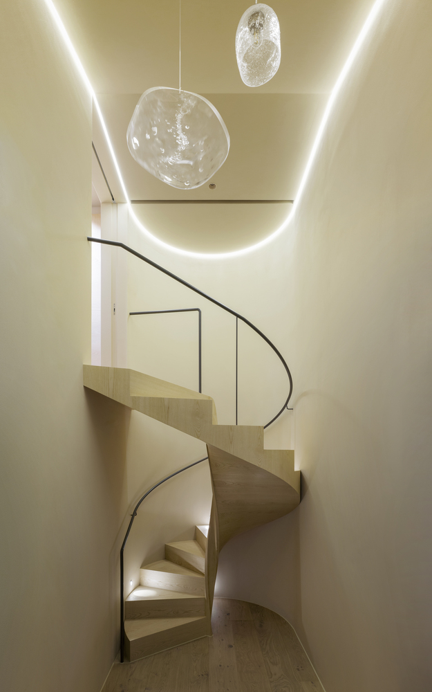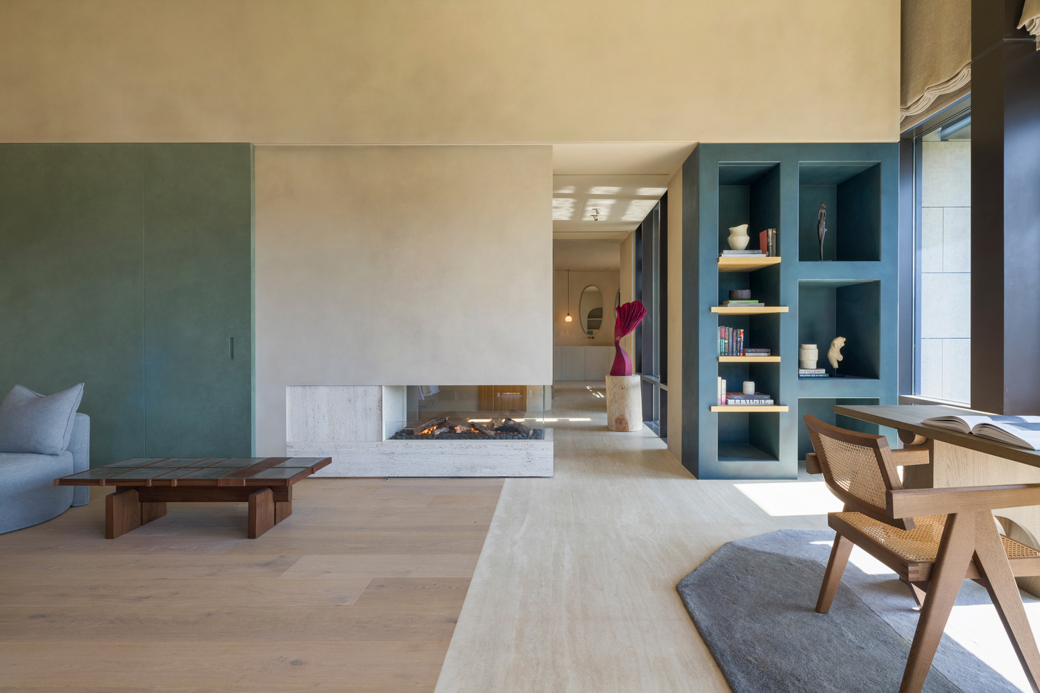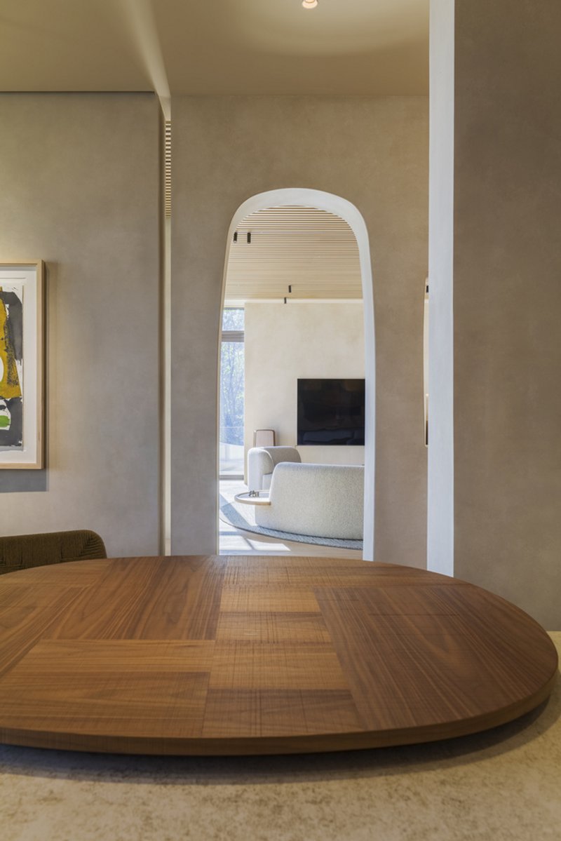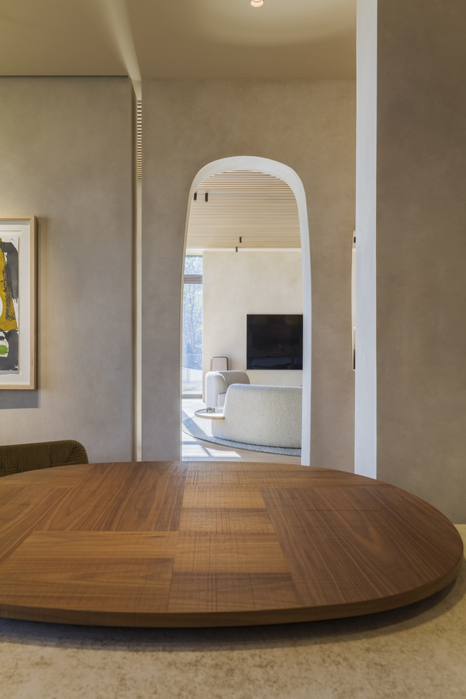 Central to the design is the theme "Echoes of the Earth." The villa’s architecture captures the undulating lines of the mountain ridges and brings them into the living space through curved staircases, soft transitions between rooms, and window frames that mirror the surrounding topography. These gestures translate the language of the landscape into tangible, livable forms. Instead of compartmentalized rooms, the design embraces spatial fluidity, allowing light, air, and nature to pass uninterrupted through the home.