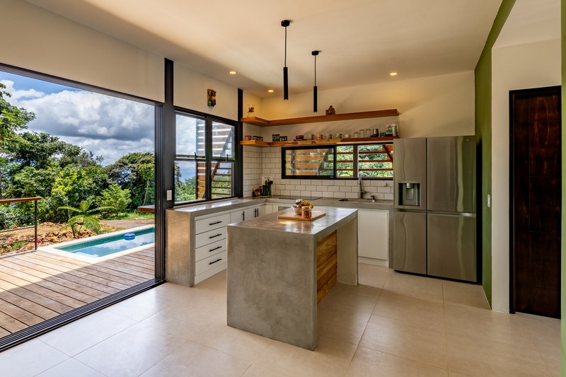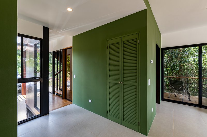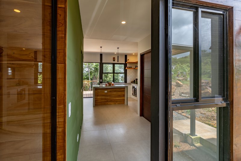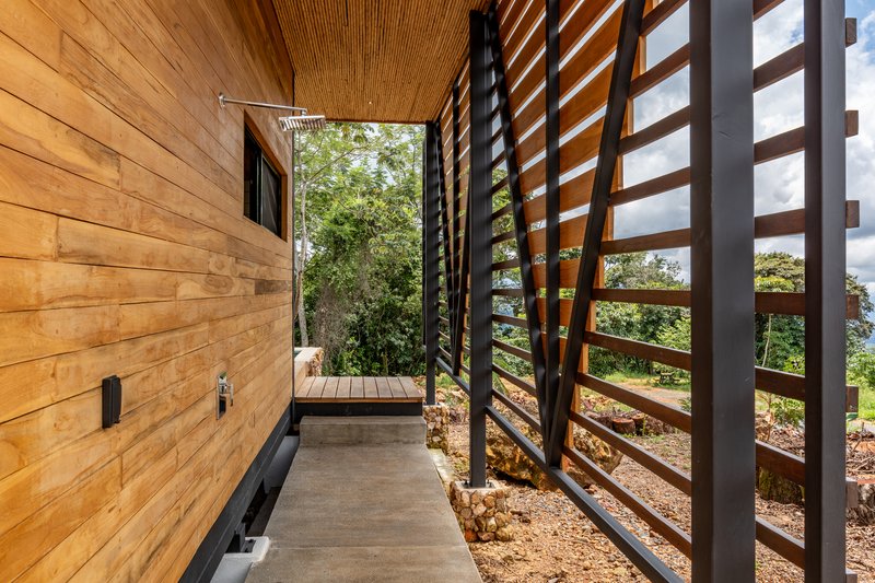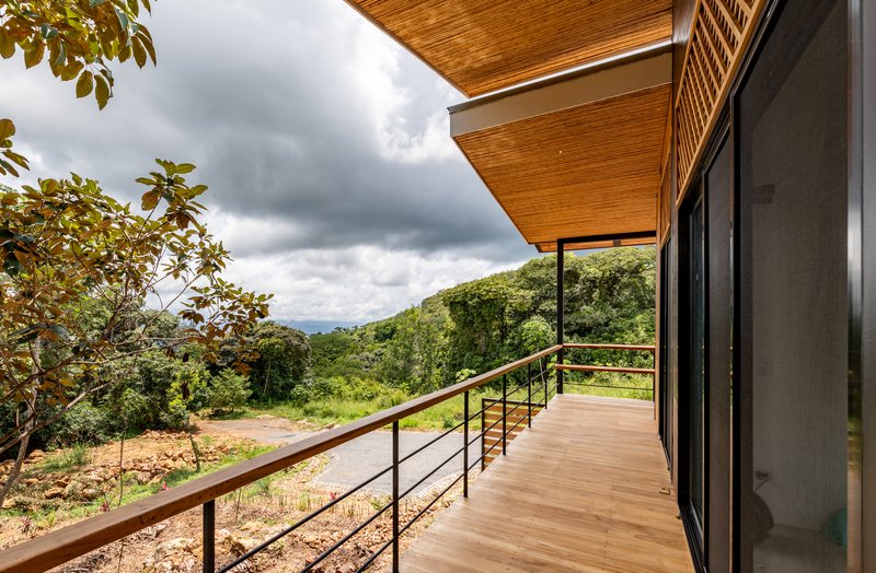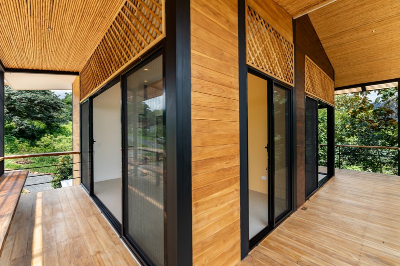 The exterior features a teak wood veil, adding a layer of privacy while allowing natural breezes to permeate. This element not only serves functional purposes but also stands as a testament to local craftsmanship, reinforcing the home's identity and connection to Costa Rican traditions.