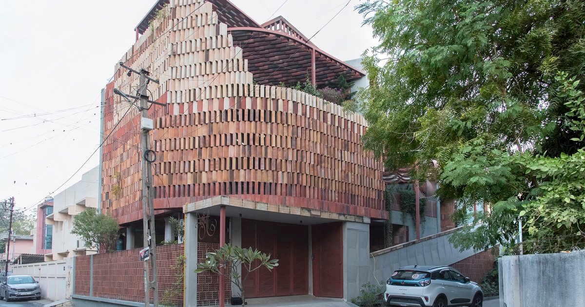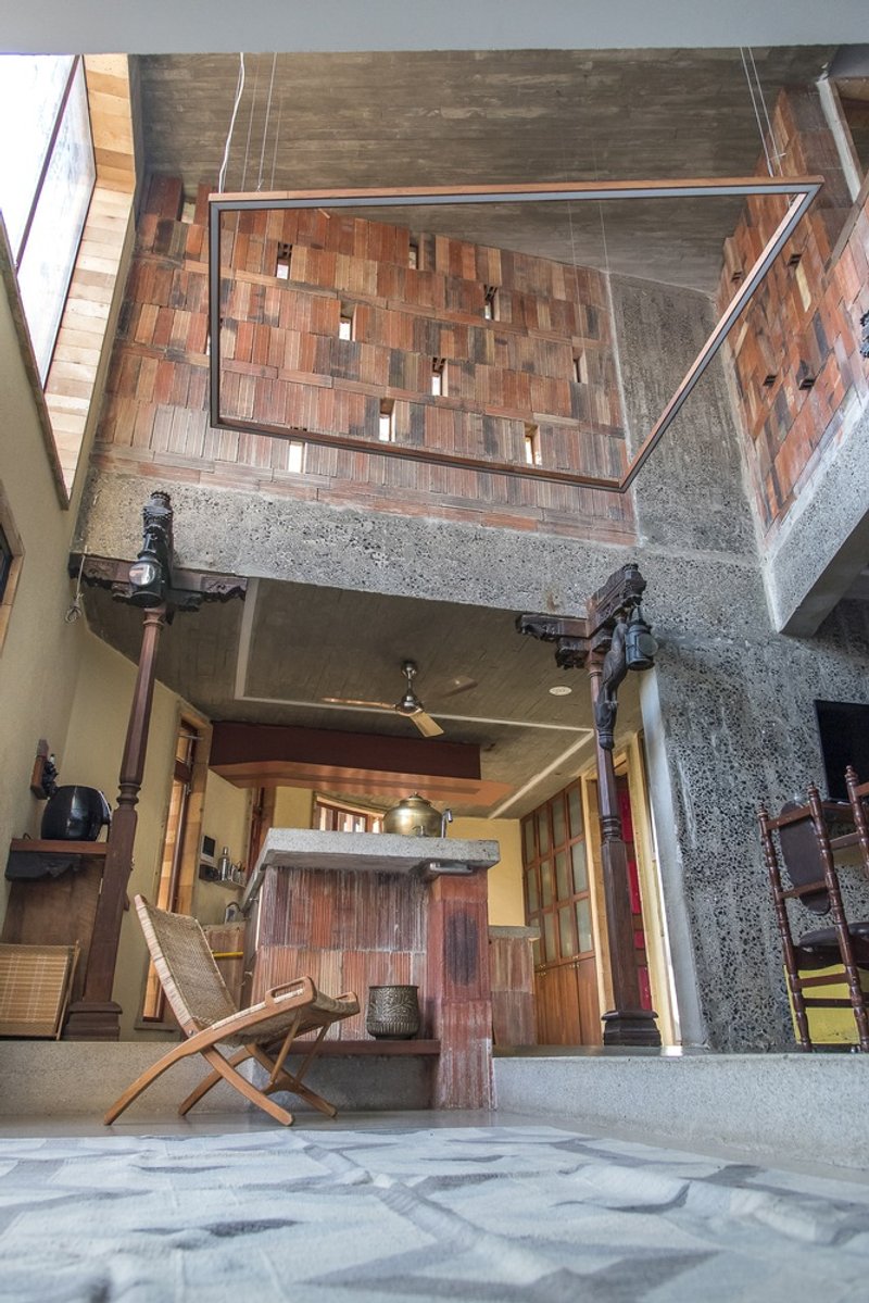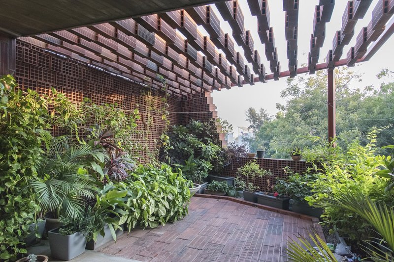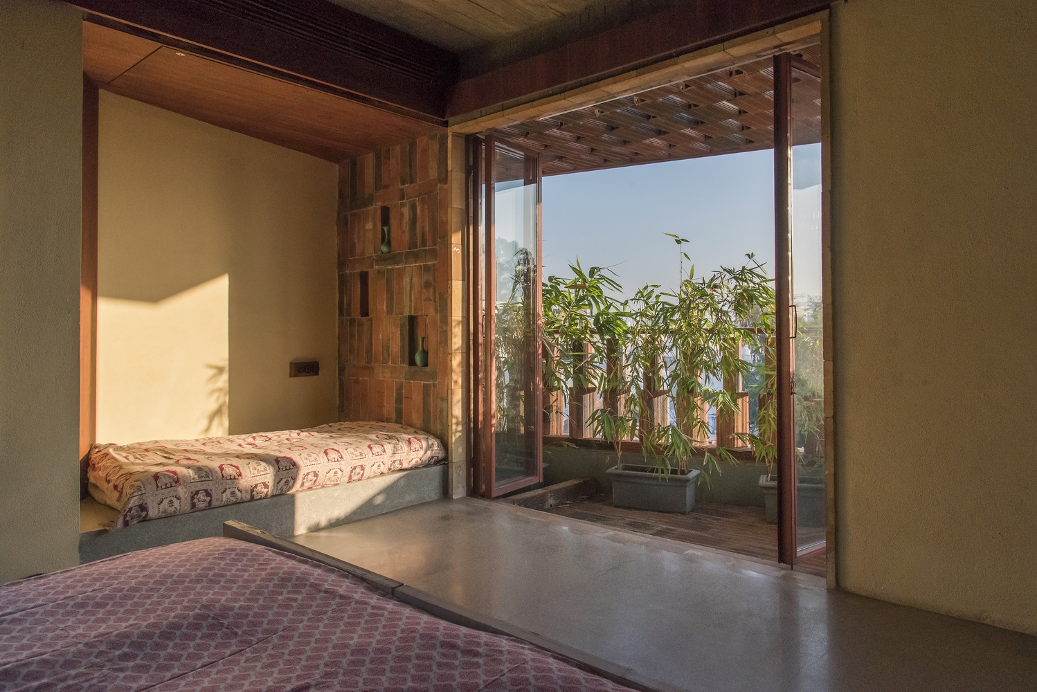 The design prioritizes natural ventilation and daylighting. Light wells are strategically located throughout the residence to allow sunlight to filter deep into the interior, reducing dependence on artificial lighting. In response to Rajkot’s climate, the south-facing façade features a striking terracotta screen wall that filters harsh sunlight while maintaining privacy and airflow.
