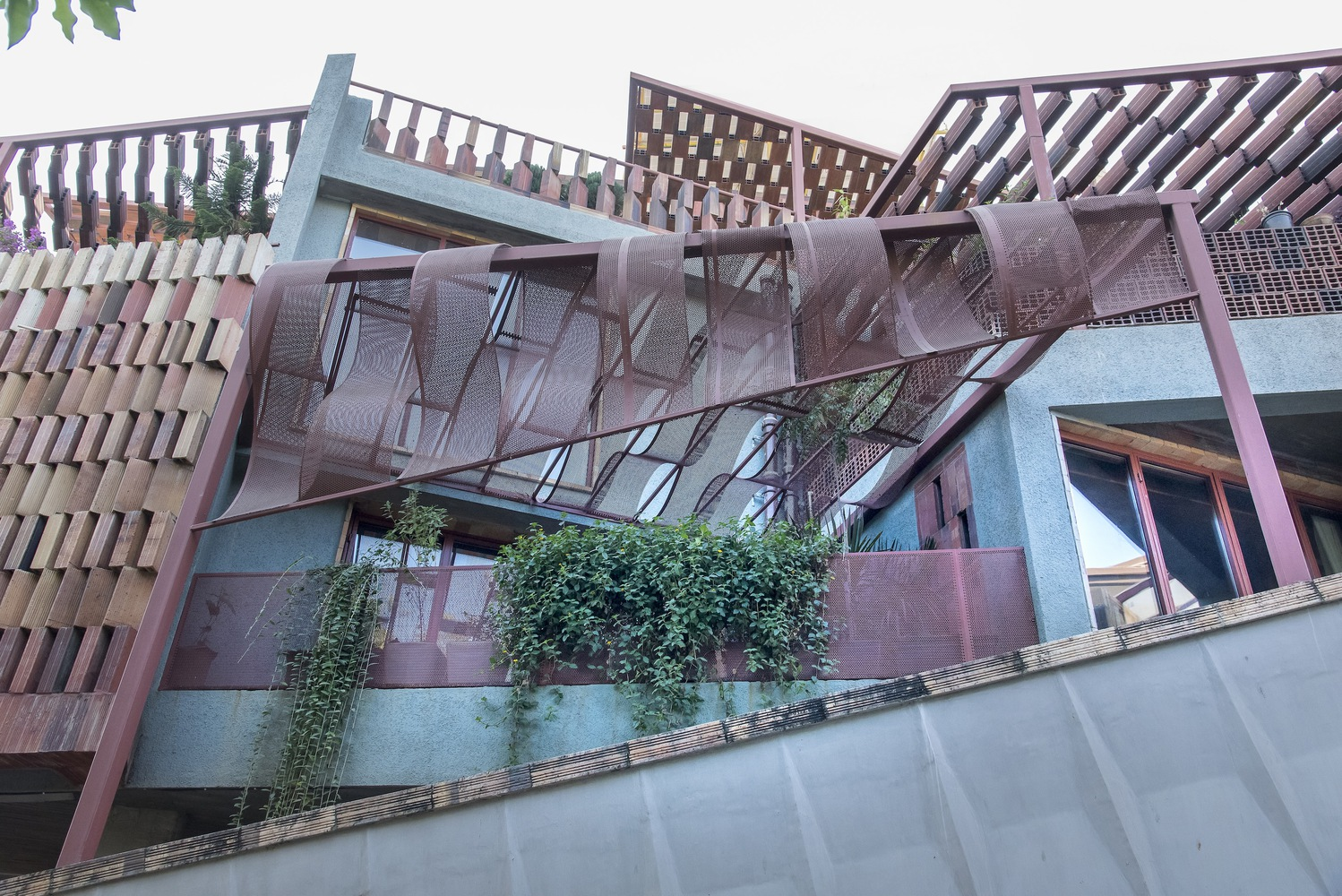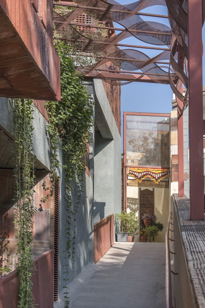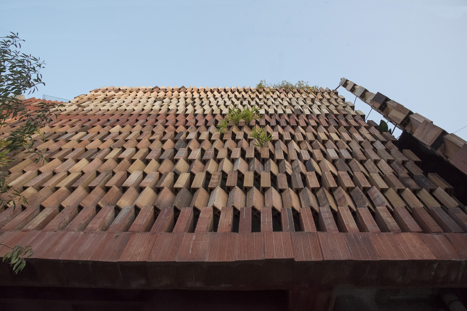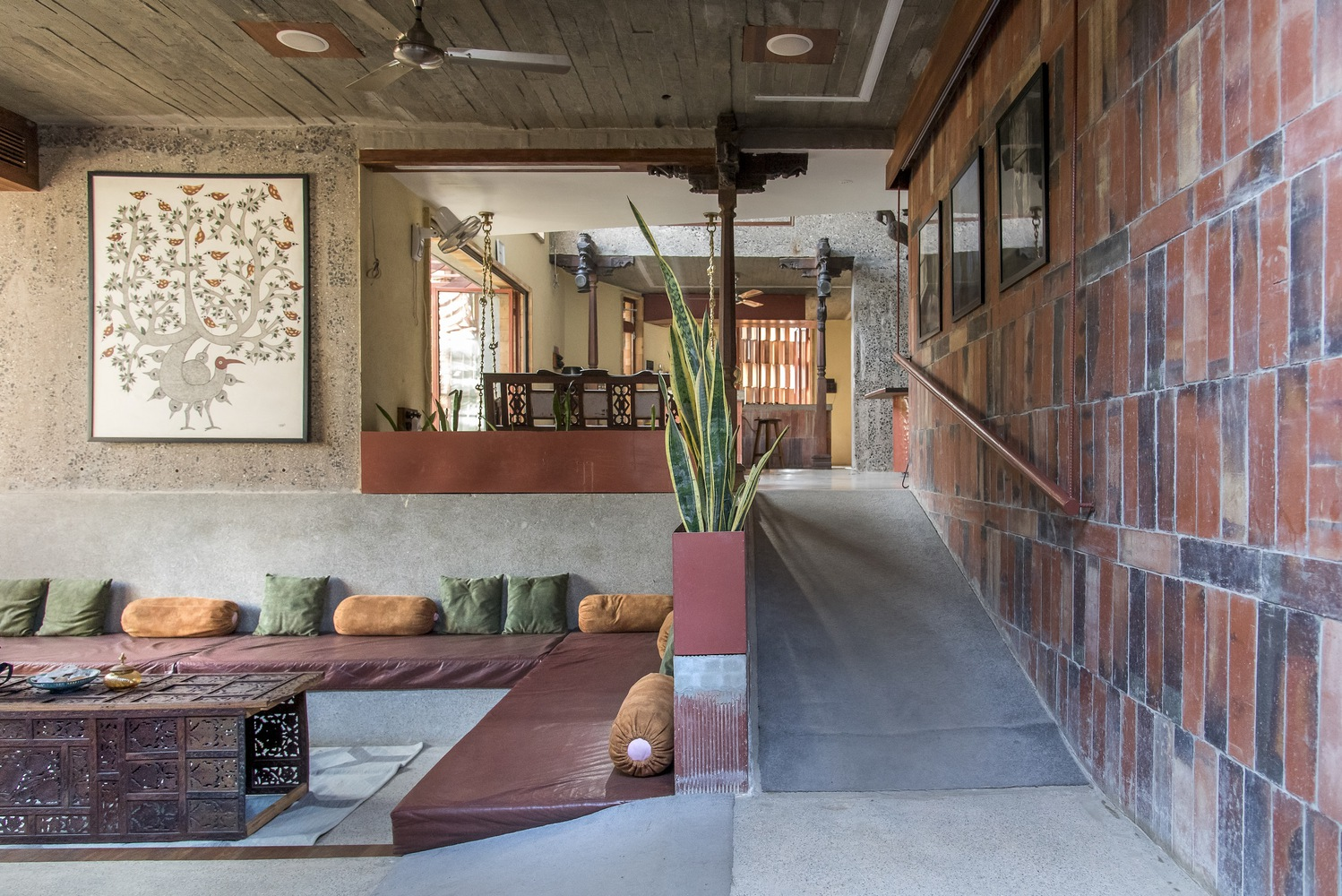 The design prioritizes natural ventilation and daylighting. Light wells are strategically located throughout the residence to allow sunlight to filter deep into the interior, reducing dependence on artificial lighting. In response to Rajkot’s climate, the south-facing façade features a striking terracotta screen wall that filters harsh sunlight while maintaining privacy and airflow.