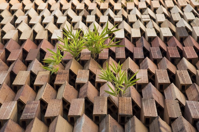 The Eco Oasis House is grounded in an earthy, tactile material palette that includes terracotta blocks, exposed concrete, and warm wood accents. Interiors are characterized by minimal finishes, reducing construction waste and enhancing longevity.